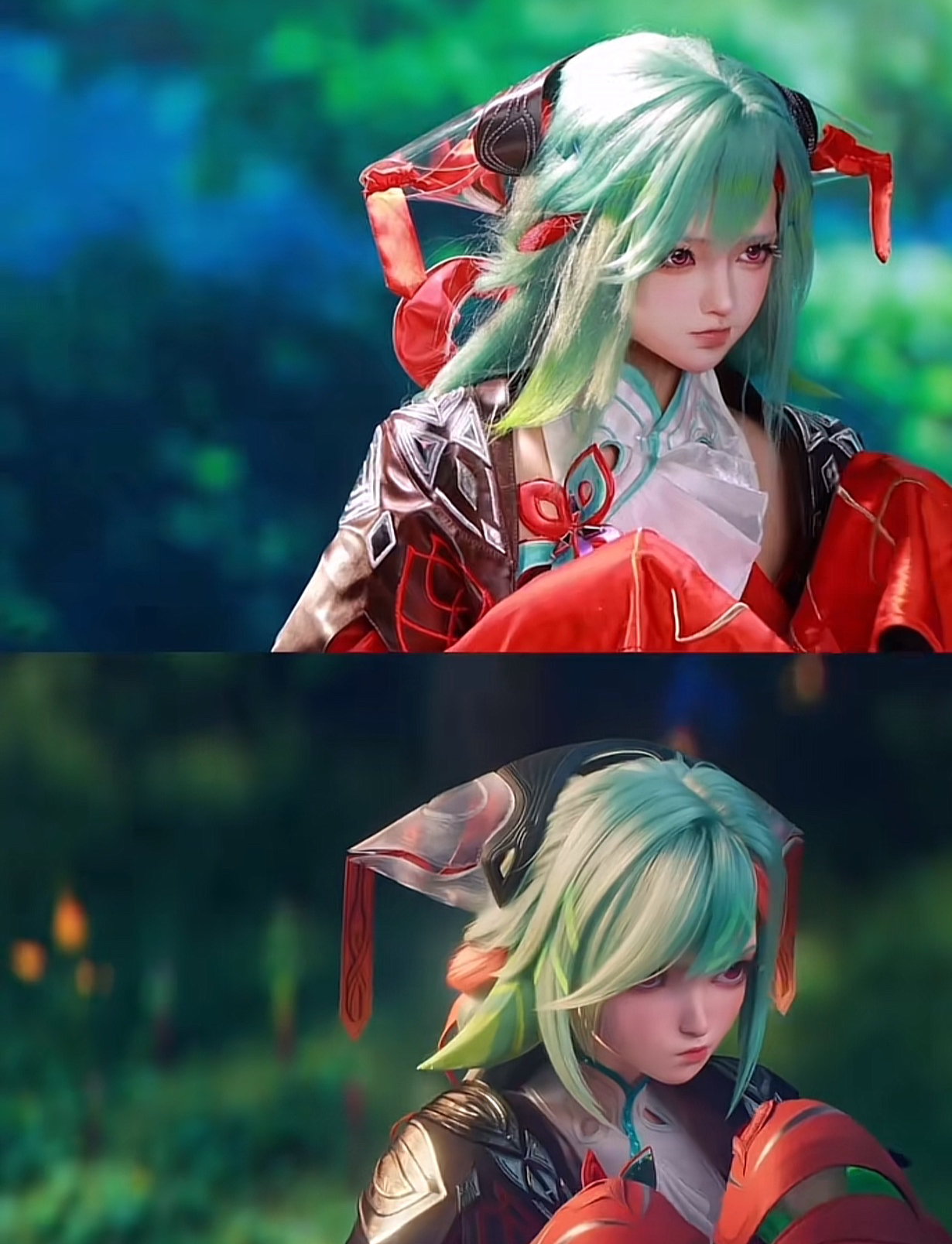 另外,第二个造型就是她还cos过少司缘,对比cg中的少司缘,团宝cos的造型甚至更传神。能看到她身穿一身红色的衣裙,头上戴着一头绿色的假发,头顶上还有一对红色的犄角,看起来很还原。
