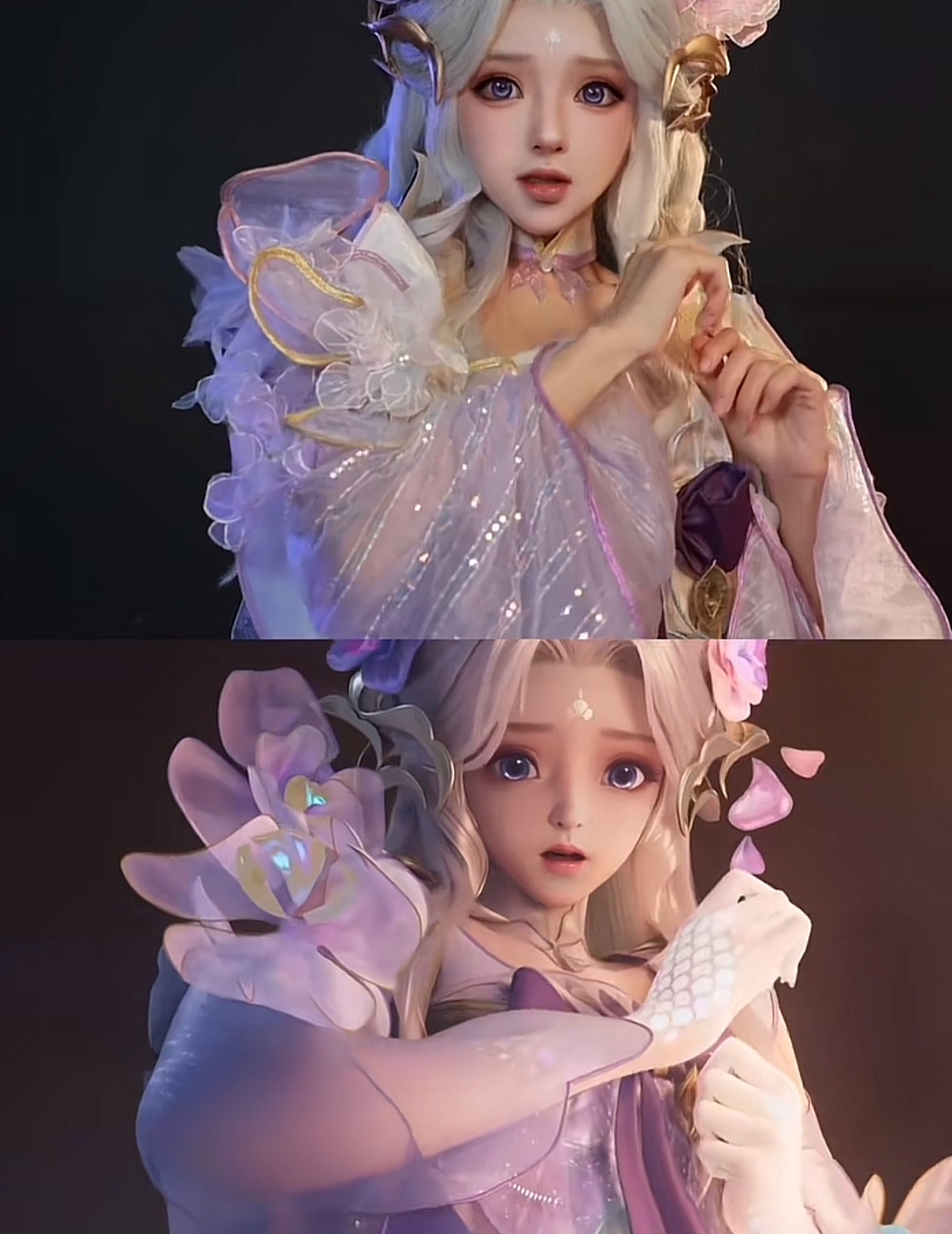 并且,为了还原造型,她手中甚至还捧着一朵白色的荷花,看起来很不错。不过对比cg中的形象,她的这个眼睛没有那么大,如果眼睛更圆更大一点就更好了。而且她的这个背景也是经过了特意ps的,看起来很不错。