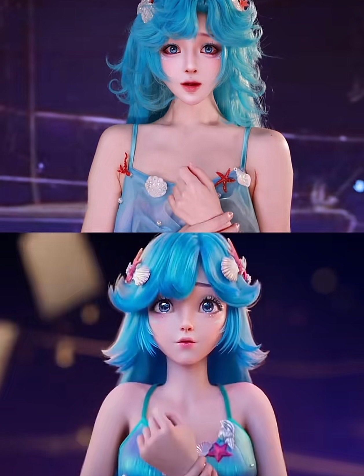 当然,她cos的朵莉亚鲛人形象,表情也是神似。不过她手上的人鱼鳞片却没有还原,搭配她紫色的美瞳,看起来更可爱。