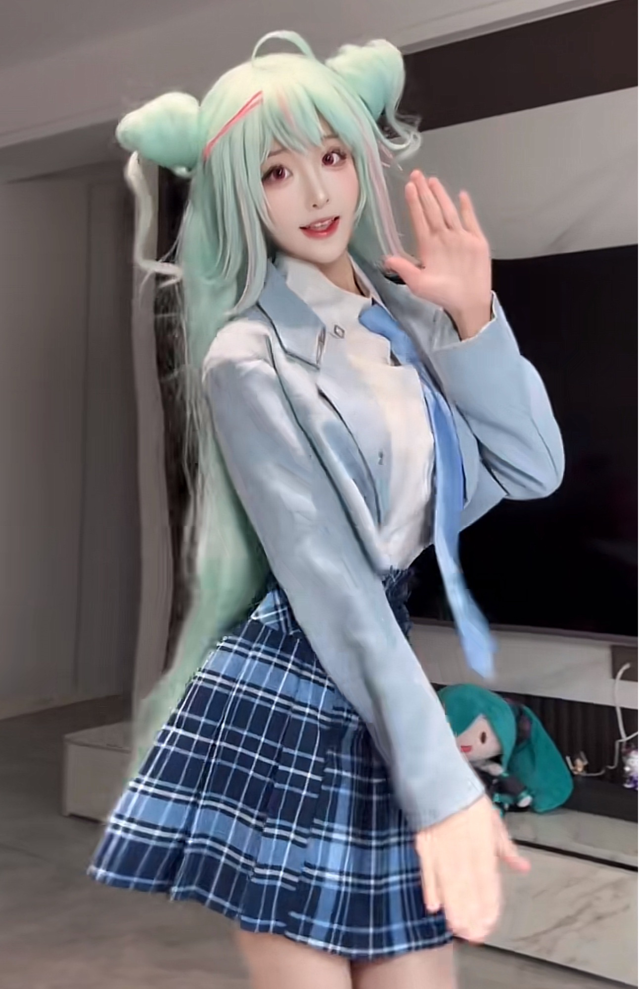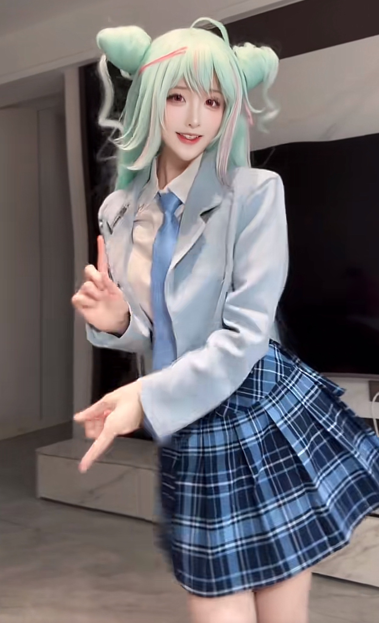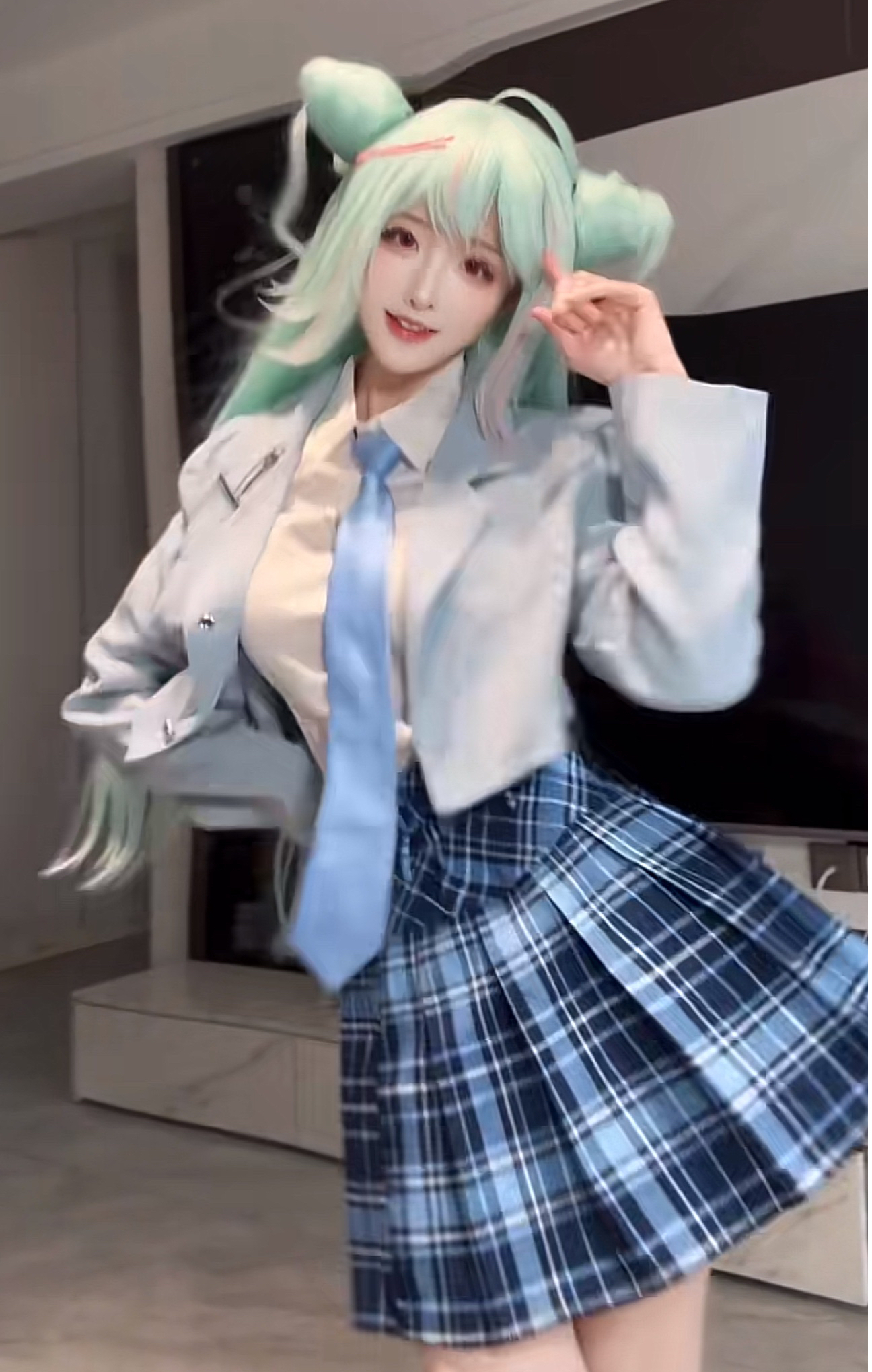 当然,她头上还戴了一顶绿色的假发,假发两边扎了丸子头,看起来特别的可爱,并且这个丸子头看着也是挺大的,她的头发流了起来,卷卷的看起来更加的可爱了。