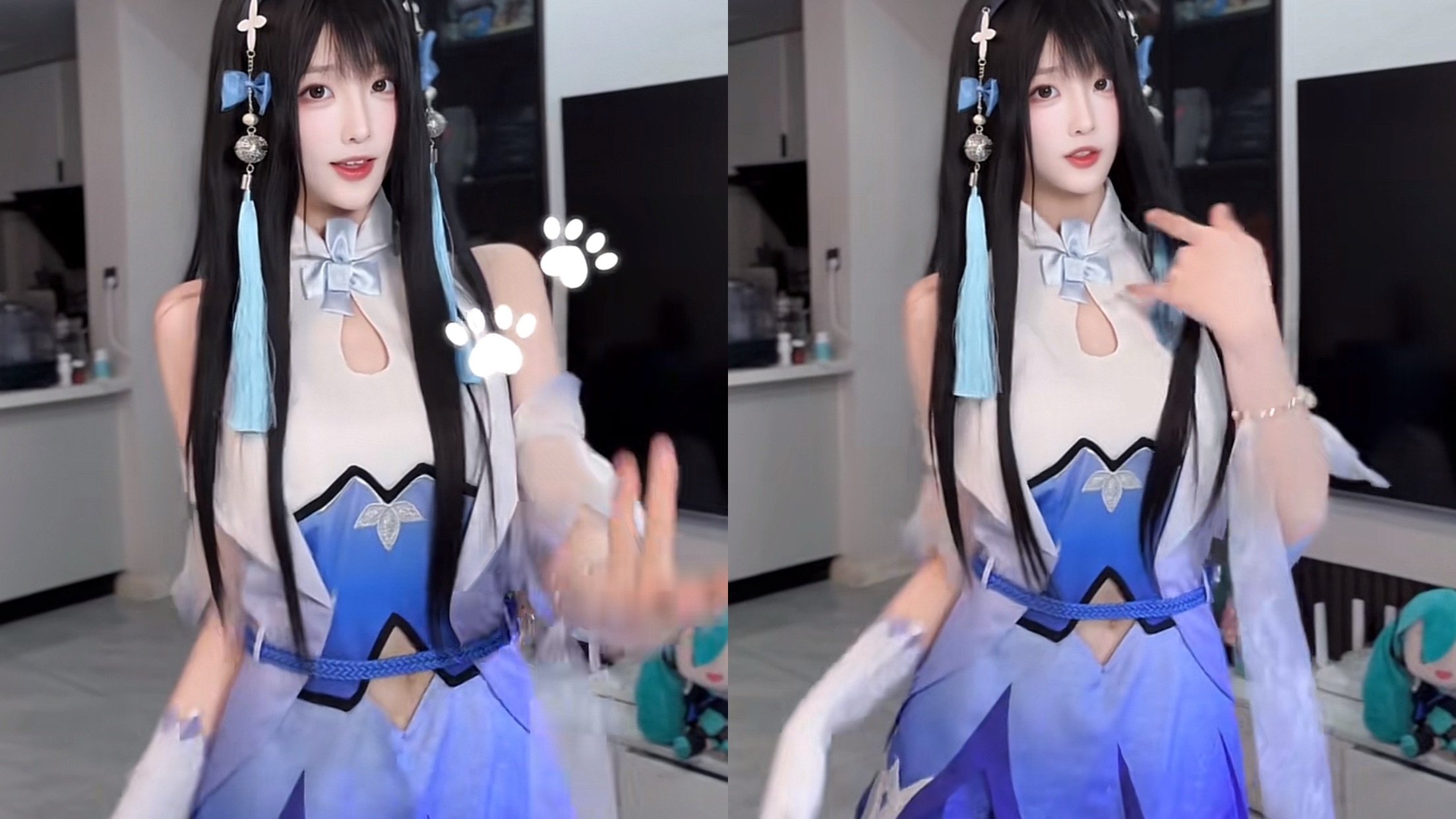当然,她还cos过西施的原皮肤,这个形象也是很可爱的,造型很清纯。能看到她身穿一身蓝色的衣裙,头上戴着一头黑色的假发,上面还有蓝色的头饰,看起来同样很可爱。如果她的拍摄背景是那种纯色的拍摄背景就更好了,看起来会更不错。