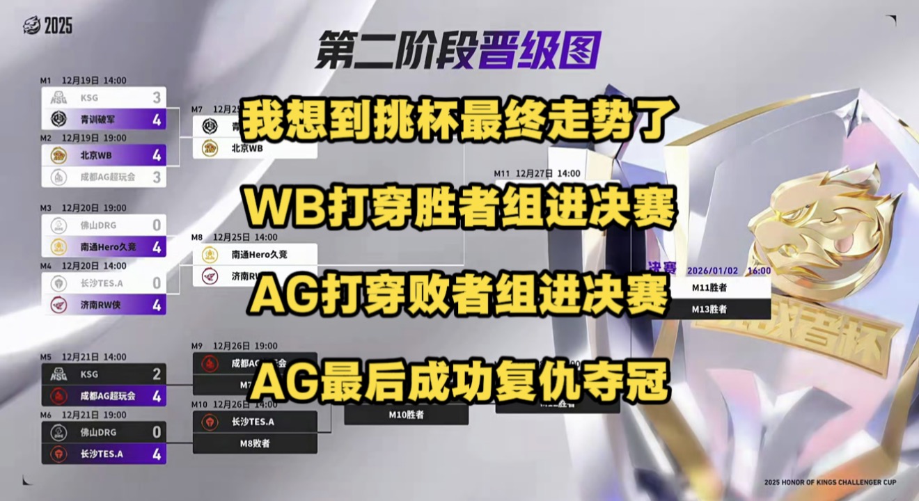 兄弟们,我想到挑杯的最终剧本了,WB打穿胜者组闯入总决赛,而AG则是打穿败者组进入总决赛,最后总决赛的舞台上,AG成功复仇WB,拿下八连冠!