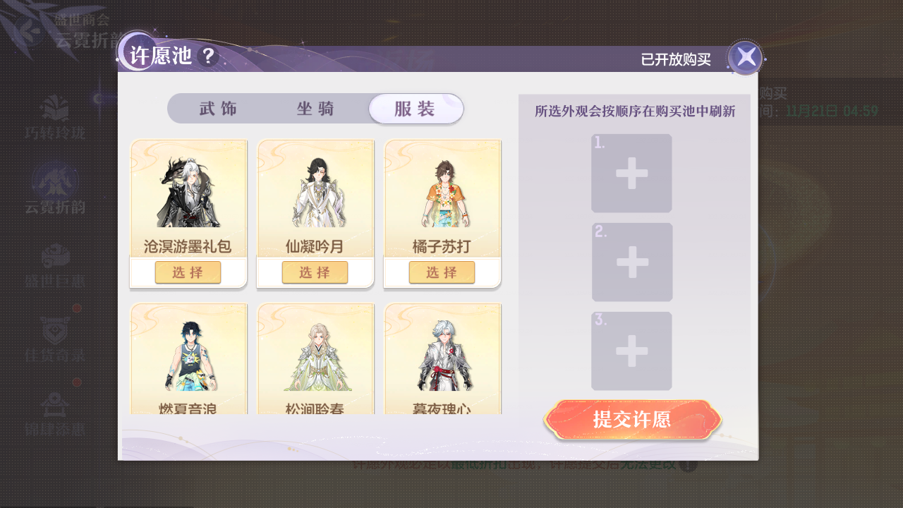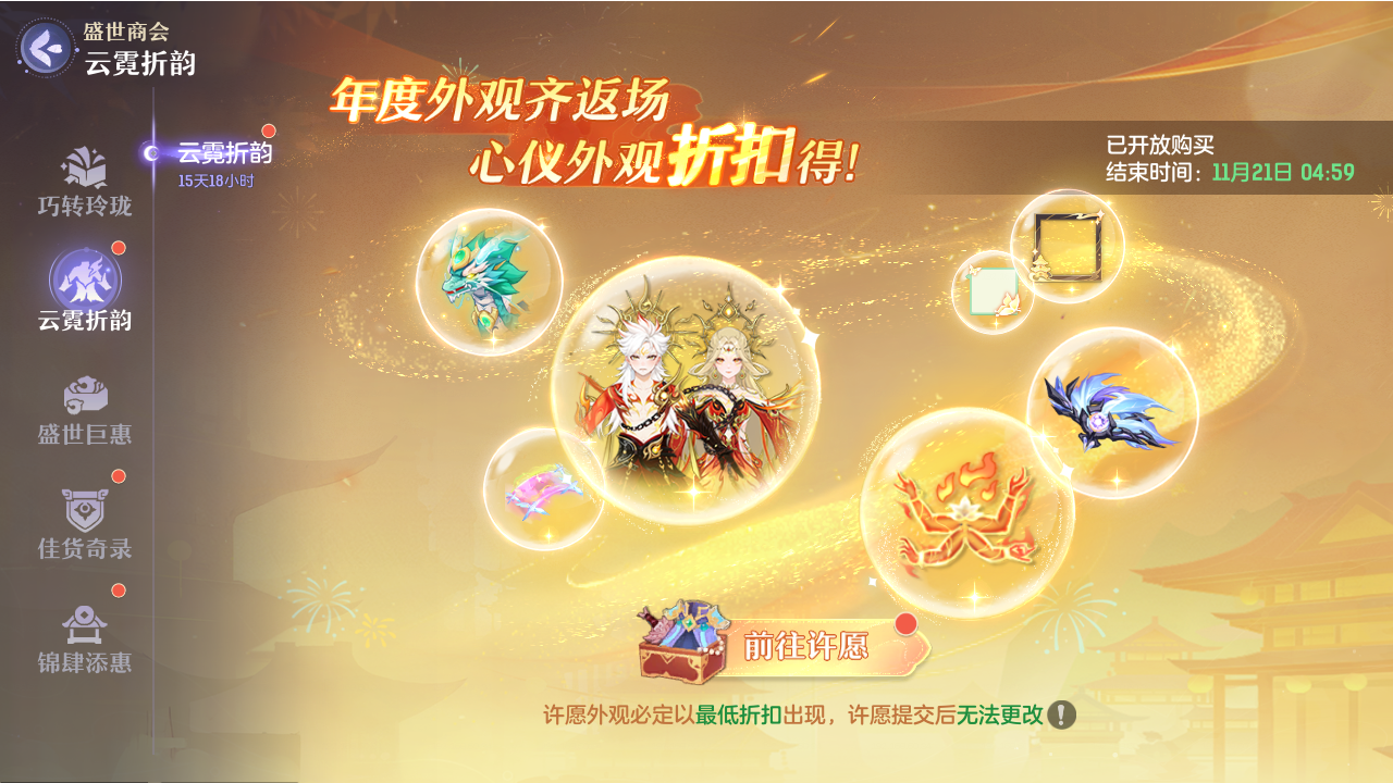 年度外观齐返场,心仪外观折扣得!活动持续期间内,云霓折韵商店将会提供大量过往返场外观进行打折出售!同时可选择3款心仪的外观进行许愿,被许愿的外观必定会以最低折扣在商店中刷新出现!