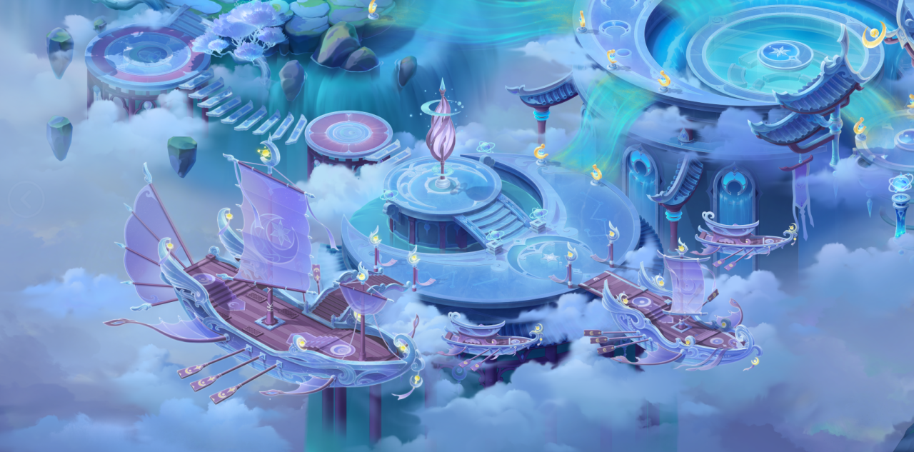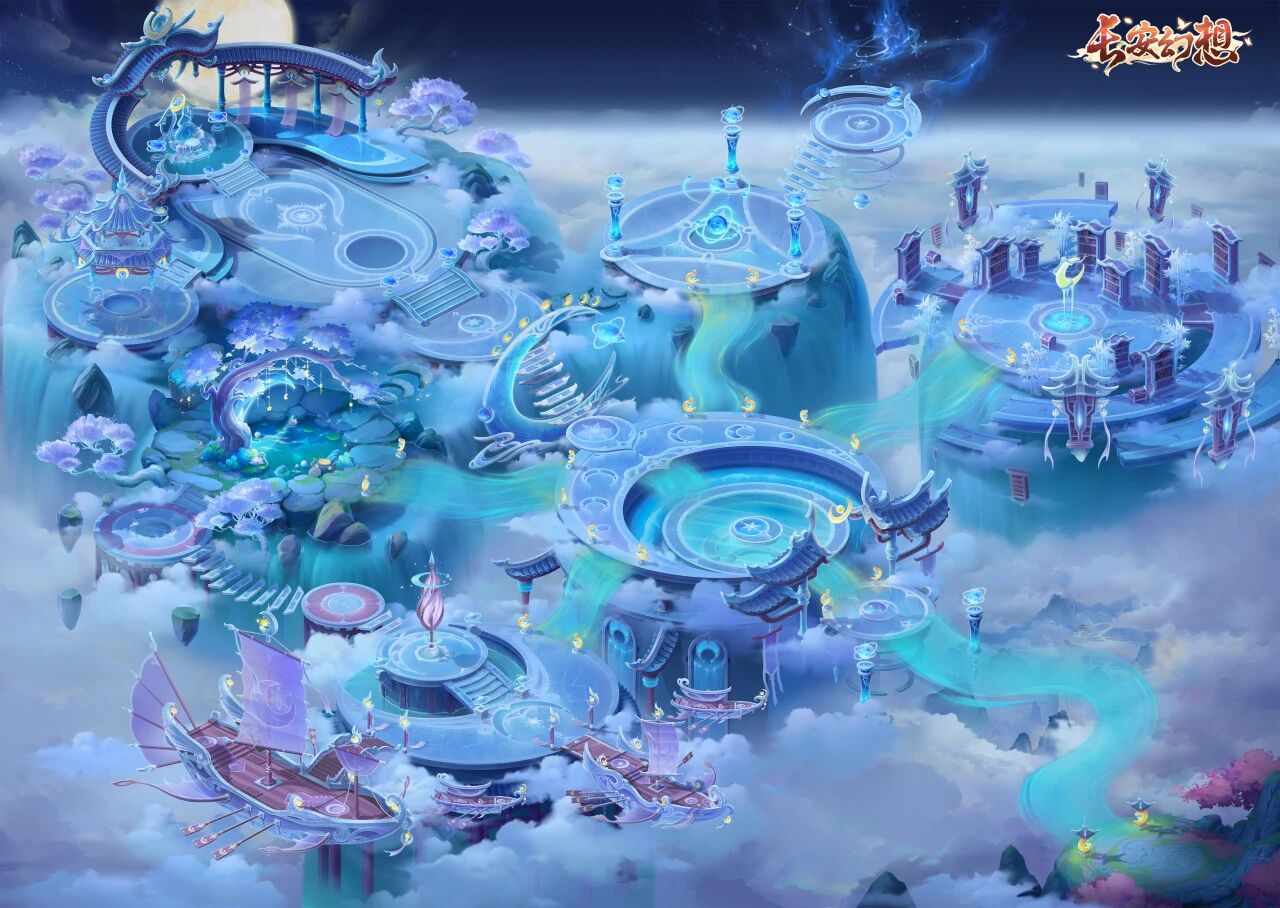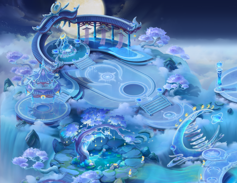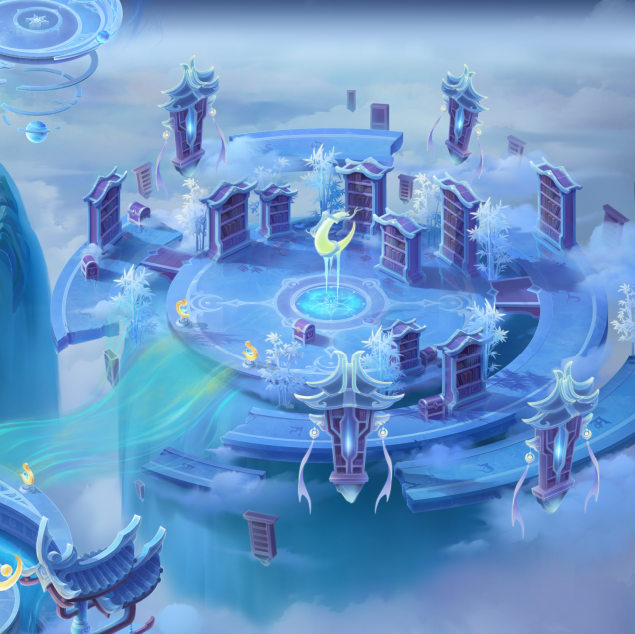 广寒宫分为七片区域,下方为昔日嫦娥、后羿生活的森林,如今的云上宫。云上宫往上为天阶,穿过翻涌的蕴含,联通走向广寒宫的圆形回廊。