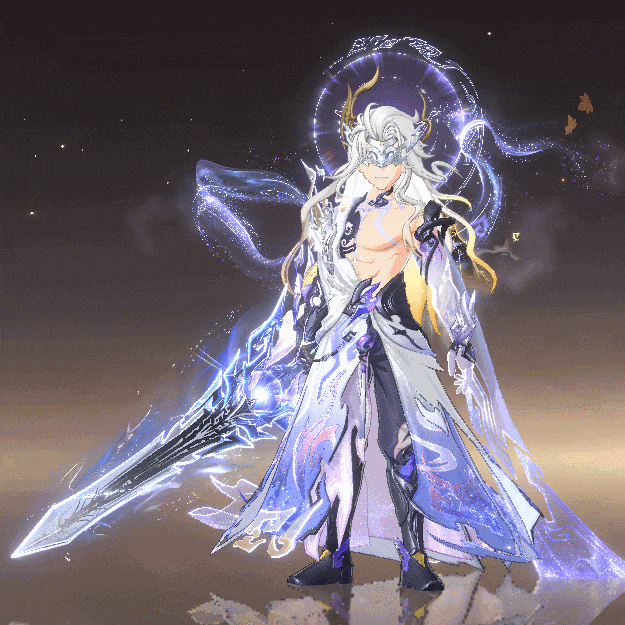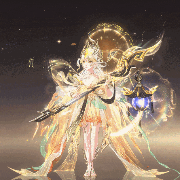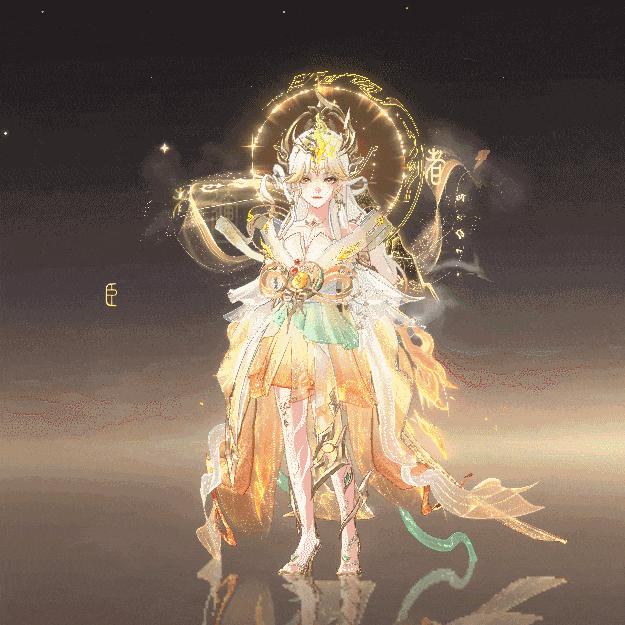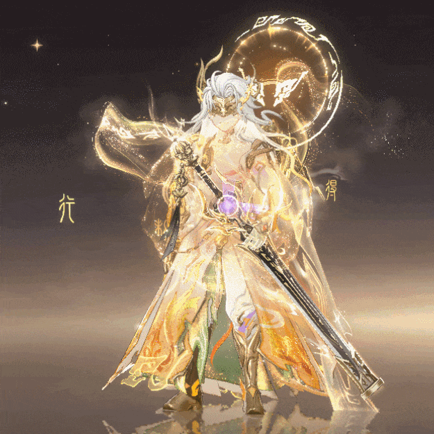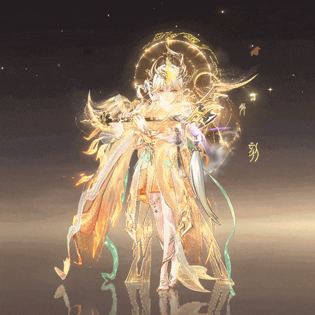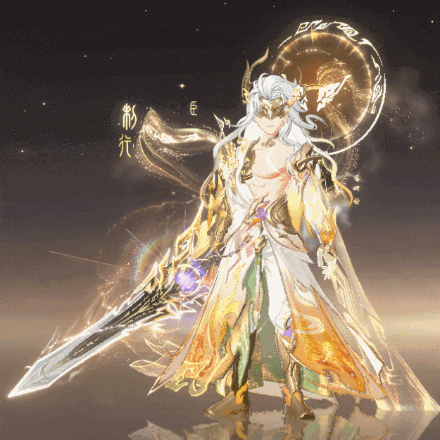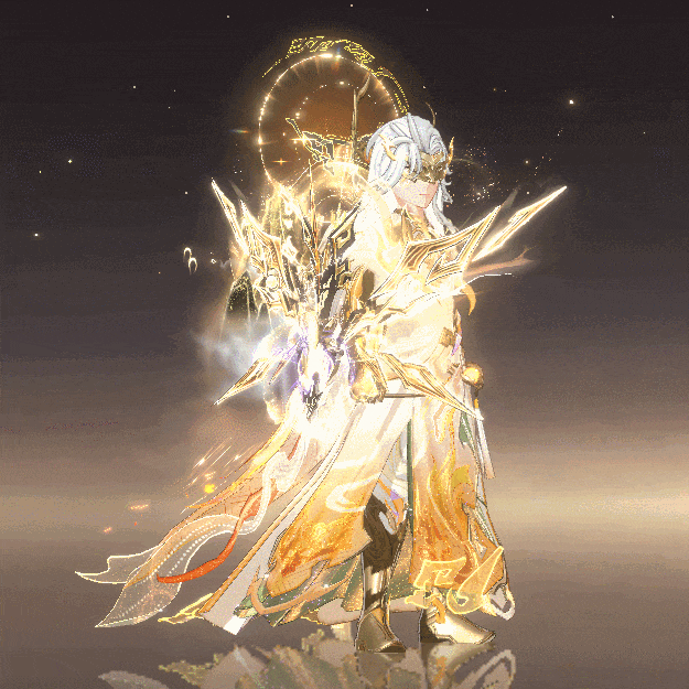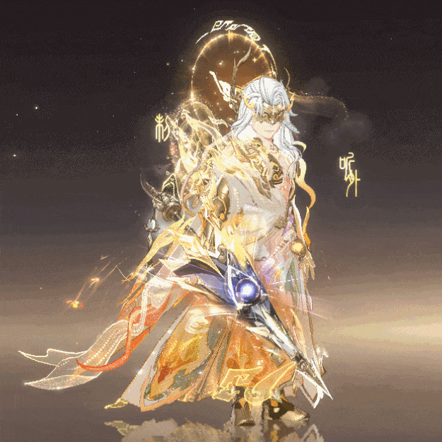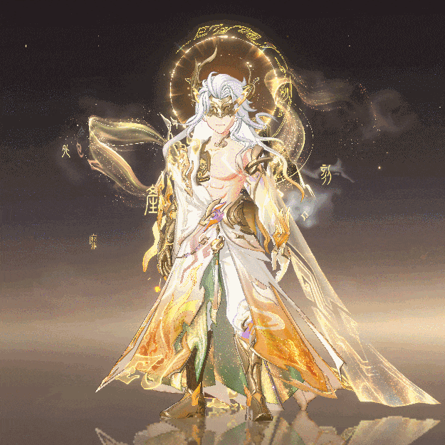 男装整体风格华丽尊贵,兼具神性与威仪。总体以鎏金与纯白为主色调,衣身线条流畅飘逸,衣摆与衣袖处的火焰纹鎏金装饰,如流动的神光般璀璨,行走时仿佛周身有圣火环绕。而轻纱与鎏金铠甲的交织,让时装保有了飘逸感同时又融入了上古神祇的威严气场。