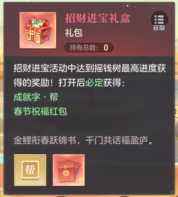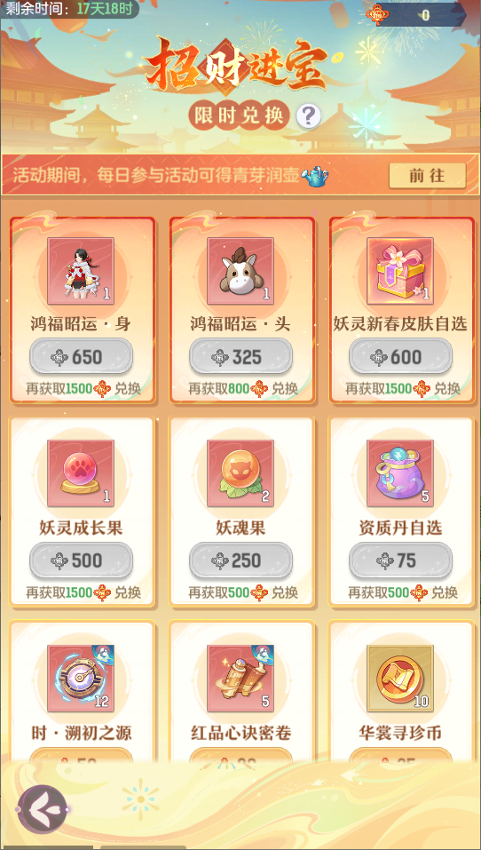 春种摇钱树,今年必定财源广进!积极参与招财进宝活动做贡献,即可兑换春节趣味时装【鸿福昭运】、妖灵新春皮肤自选等珍贵好礼!