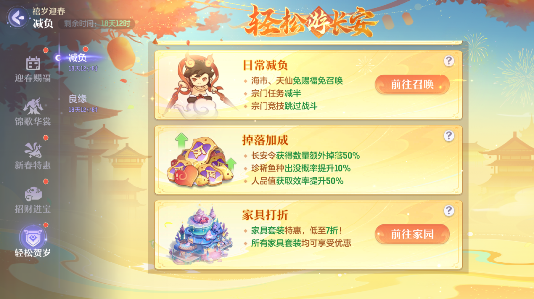 新春繁忙无暇游长安?御灵院助你放轻松!海市、天仙、宗门日常任务一律减负,掉落加成倍儿涨,更有新春家具打折优惠,焕新迎春正当时!