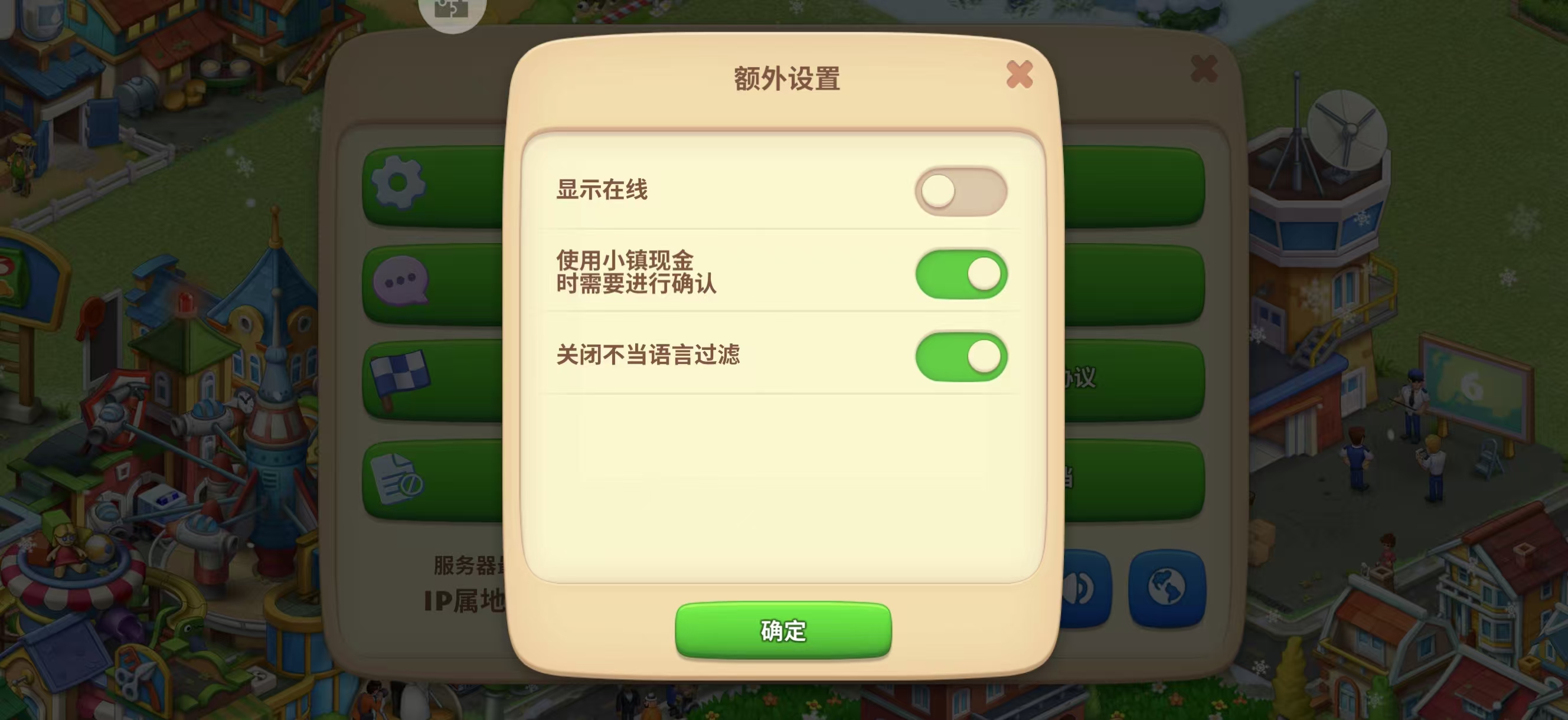 游戏右上角点击符号“三”,点击“额外设置”、点开“使用小镇现金是需要进行确认”;
