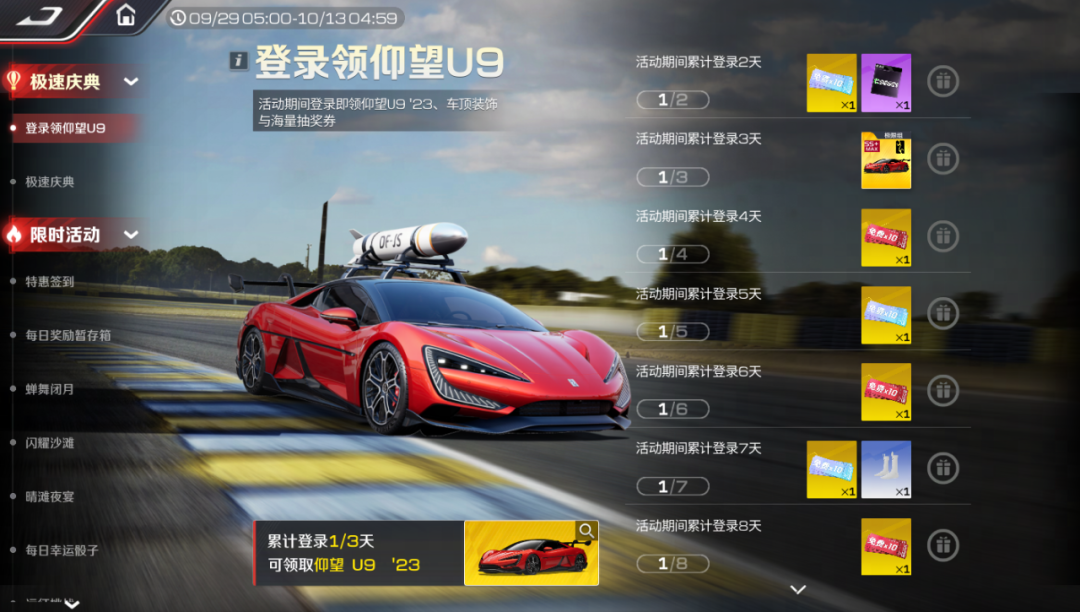 ⭐累计登够4天、6天、8天更有巅峰车展30连抽(每天10连抽奖励),可用来抽仰望U9 '23升阶。这可是提升车库战力的好机会,不要错过哦!