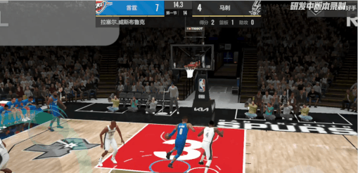 游戏中的雷霆威少拥有顶级的突破终结能力:162的突破上篮和157的突破灌篮,搭配银无畏终结者、隔扣达人、巨人克星、特技演员、对抗冲框等终结徽章,能高效地冲框得分