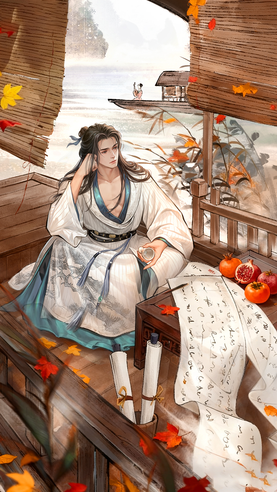 白居易对酒当歌,桌前摊开一卷卷诗集,搭配飘落的枫叶,充满诗意~