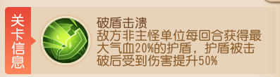 敌方非主怪单位每回合获得最大气血20%的护盾,护盾被击破后受到伤害提升50%。