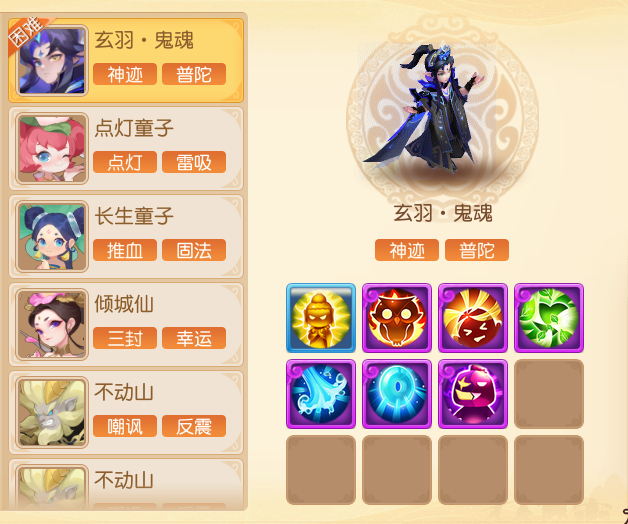 至尊四主怪为普陀山,主怪玄羽及登场小怪均为“高级鬼魂”单位,这也是本赛季的难点关卡,特性“破盾击溃”让怪物每回合坦度都颇为不俗。小怪不动山的“嘲讽”技能更是物理召唤灵的克星,更加考验输出!另外,本关主怪及小怪均不受特技影响,推荐少侠重置技能。