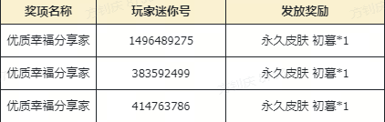 此次活动已开奖,恭喜以下玩家获得活动奖励,奖励预计将于7个工作日内发送至玩家的邮箱,请注意查收。