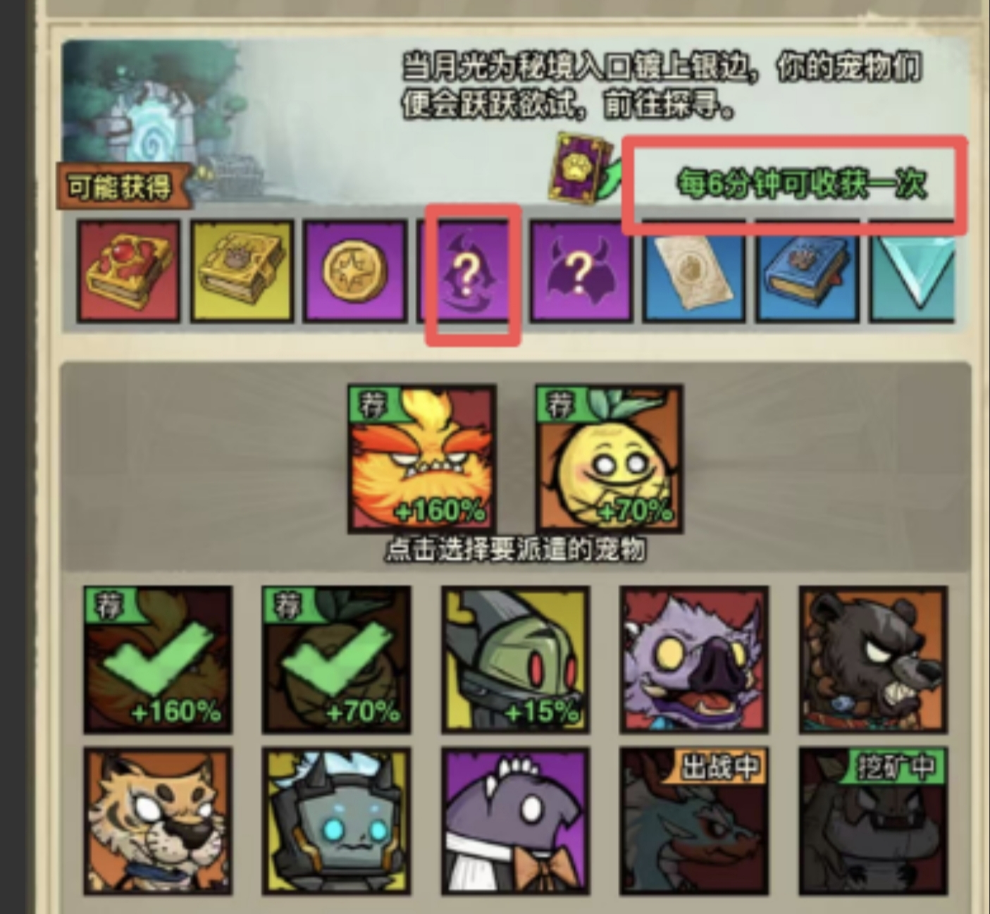 5:派遣:两个宠物一起派遣,第一档是230的效率,可以6分钟收货一次,第二档是320效率,可以5分钟收货一次