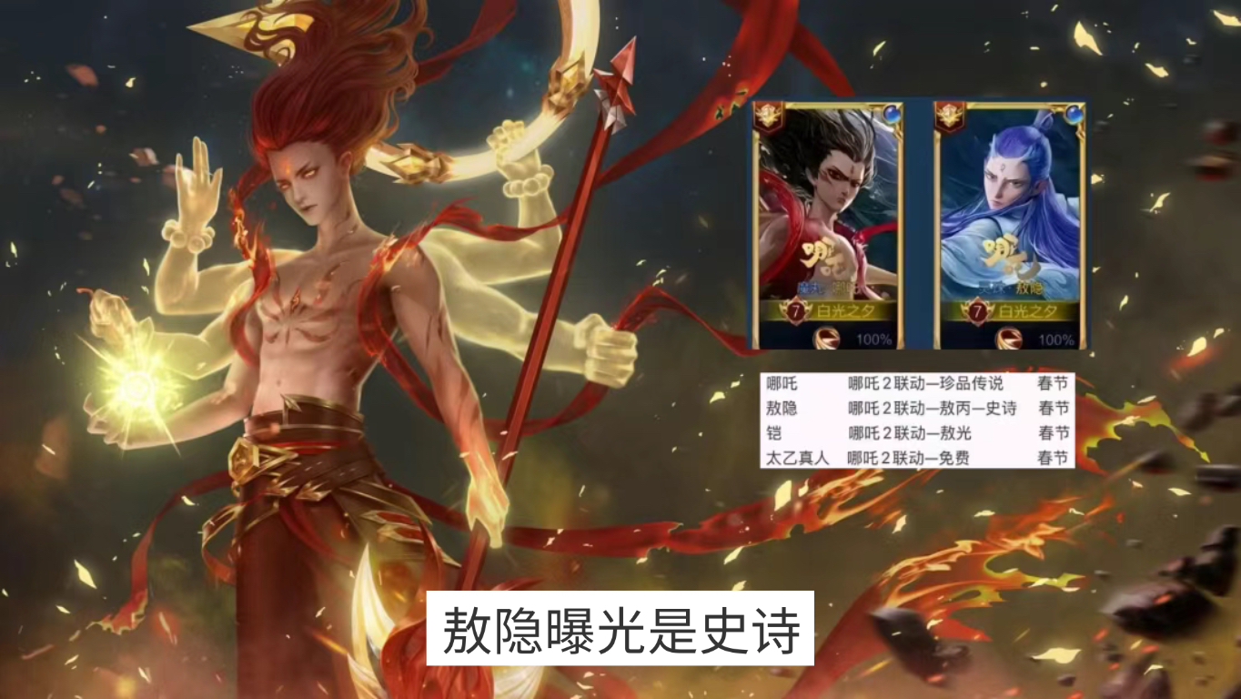 而目前曝光在哪吒联动中,敖隐的新皮肤只是一款史诗,有可能会在今年春节上线,这也是目前王者荣耀中唯一一个老英雄没有皮肤的,所以敖隐迟早都会有新皮肤,而哪吒联动应该就是第1款。