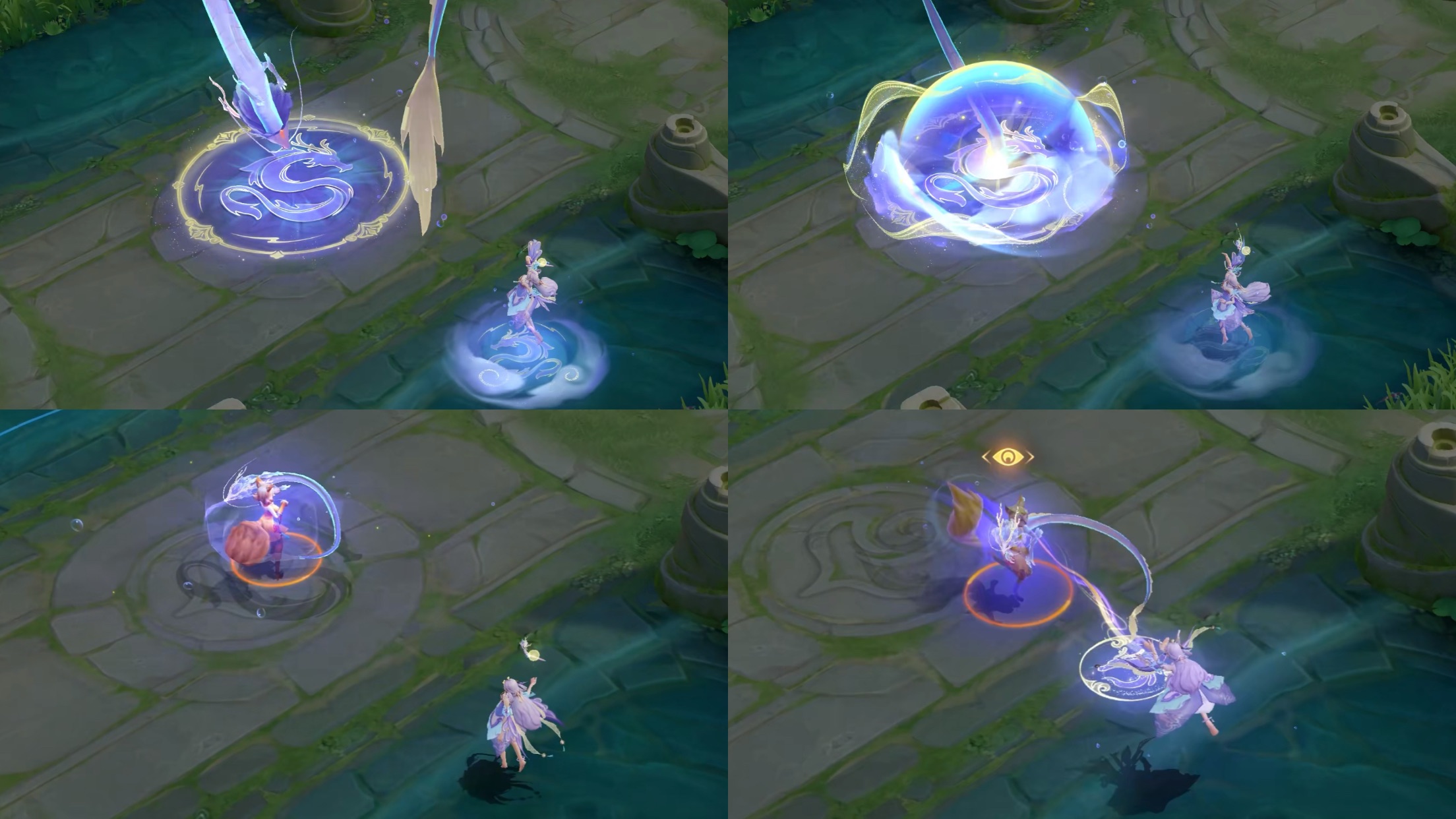 然后再来看一下二技能效果,释放之后,可以看到有一颗金色的龙珠向前,周围有些许紫色特效围绕,中间有一个金色的圆圈,指定位置之后,可以看到龙珠的周围,有一条小青龙出现,之后珠子会爆炸,展现出了一个蓝紫色的光照,可以看到里面有一条巨龙显现,周围还有一些云朵一样的设计,紧接着就慢慢的淡去,可以看到淡去之后,周围的云朵更加明显。