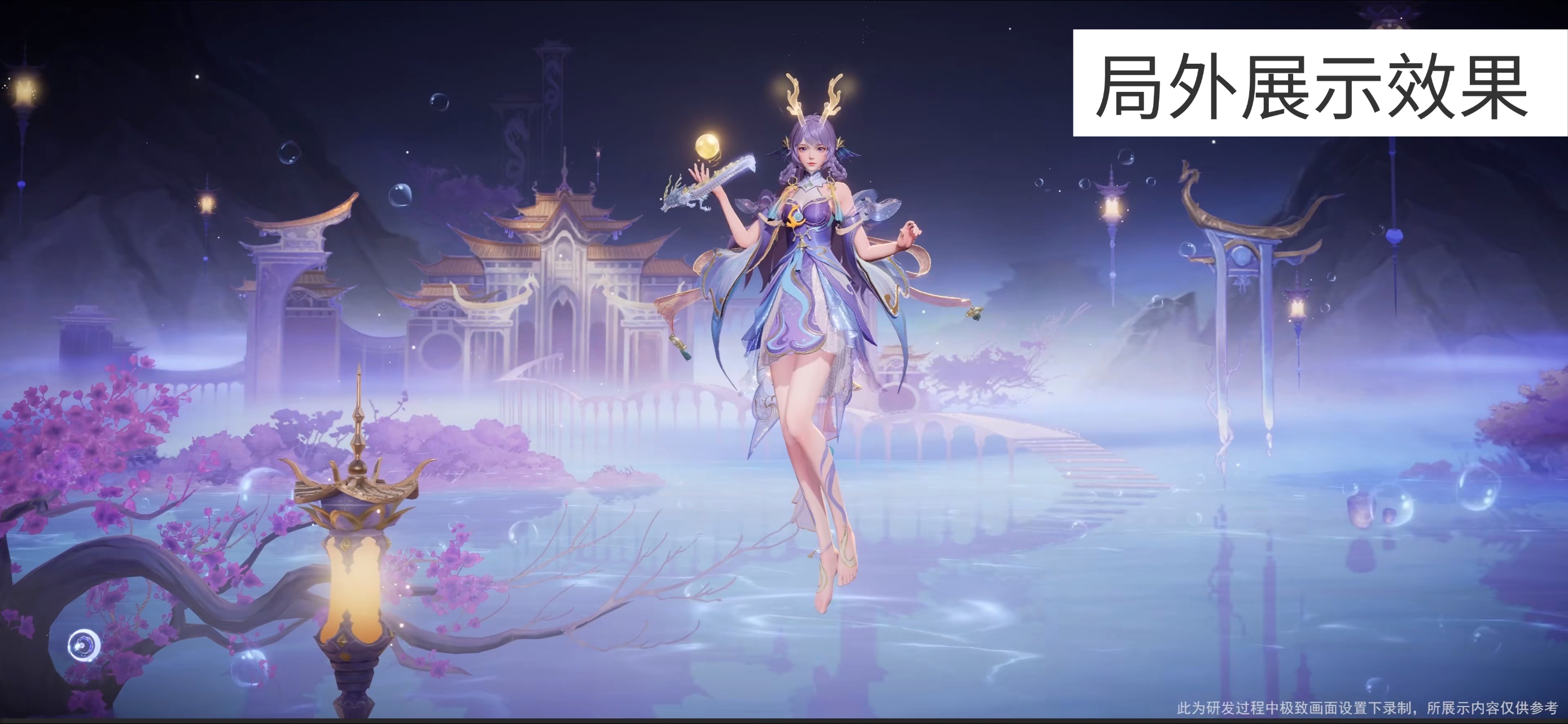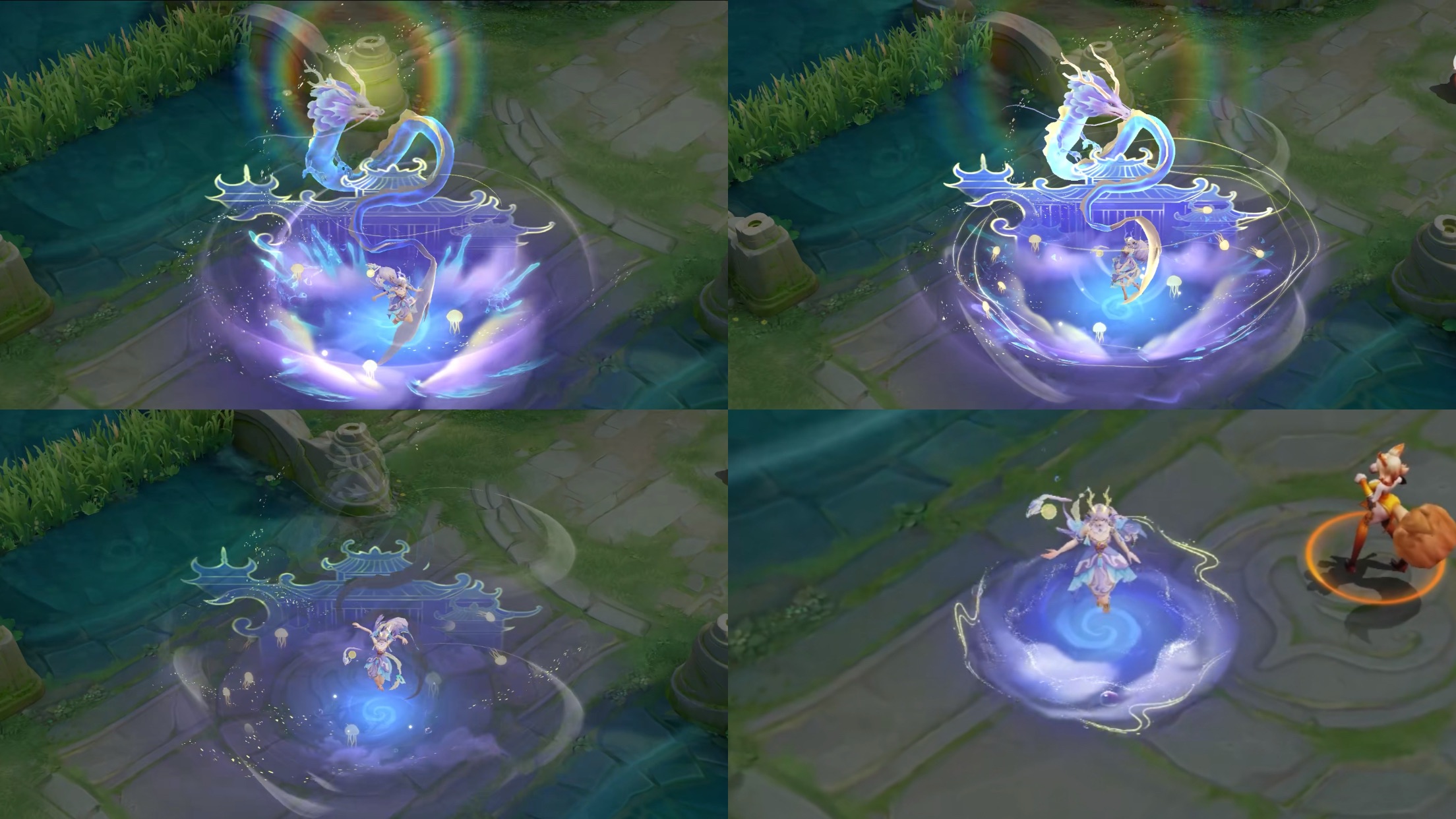 然后再来看一下三技能的设计,保留了游龙清影原本的那种效果,但是整体的特效和设计不同,在开启之后,可以看到背后出现一座宫殿,然后身边有大量云雾效果,巨龙显现,且巨龙显现的时候,在巨龙的头部周围可以看到彩虹效果,非常的震撼,释放之后,巨龙和宫殿会慢慢的淡去,最后,在西施的脚下会留下一个云雾缭绕的特效,代表着大招的持续时间还在。