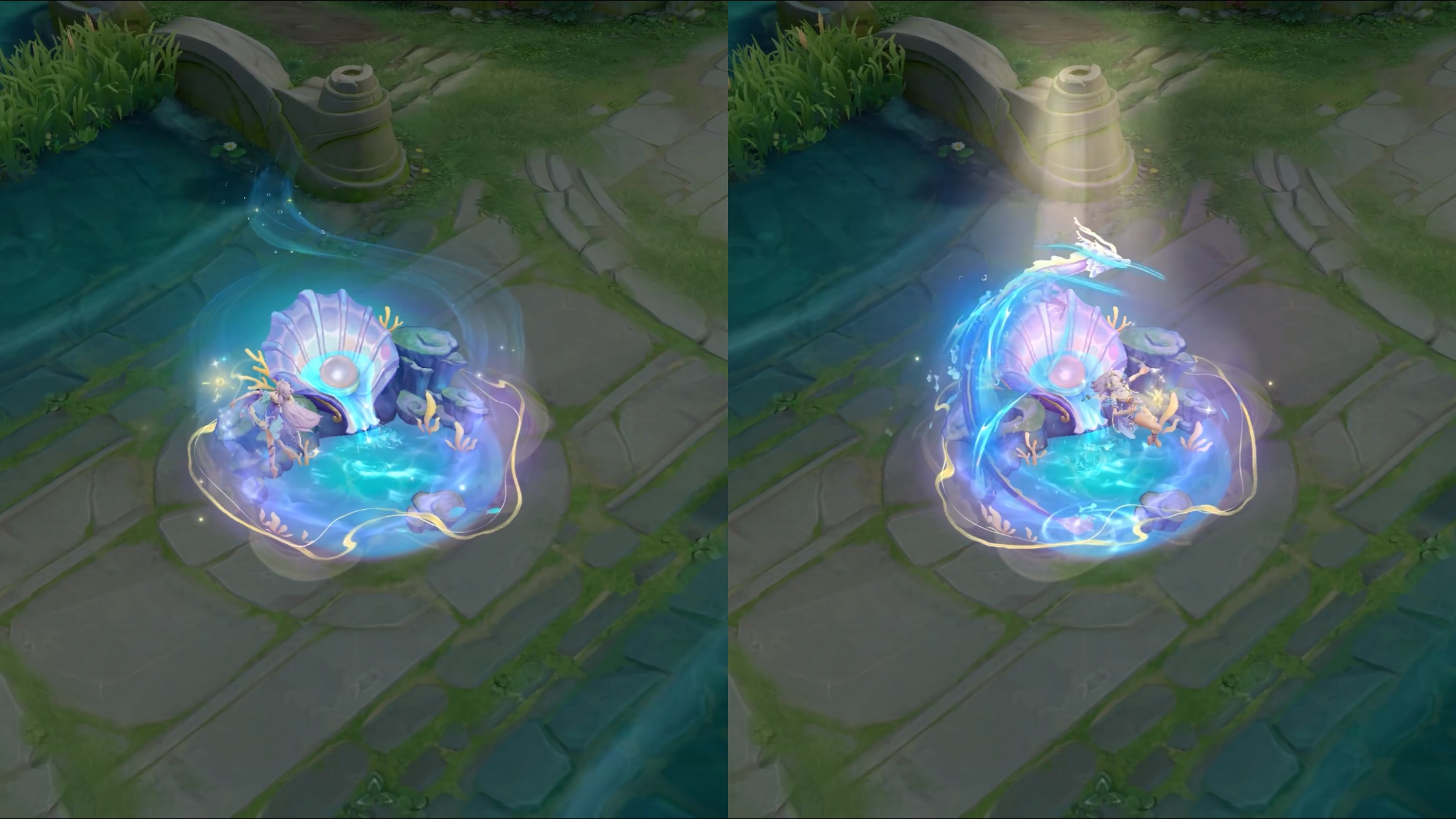整体的设计都表现出了一种海底元素,然后有一个巨大的贝壳,珍珠等设计,当然,最终回城还是和巨龙一起回家。