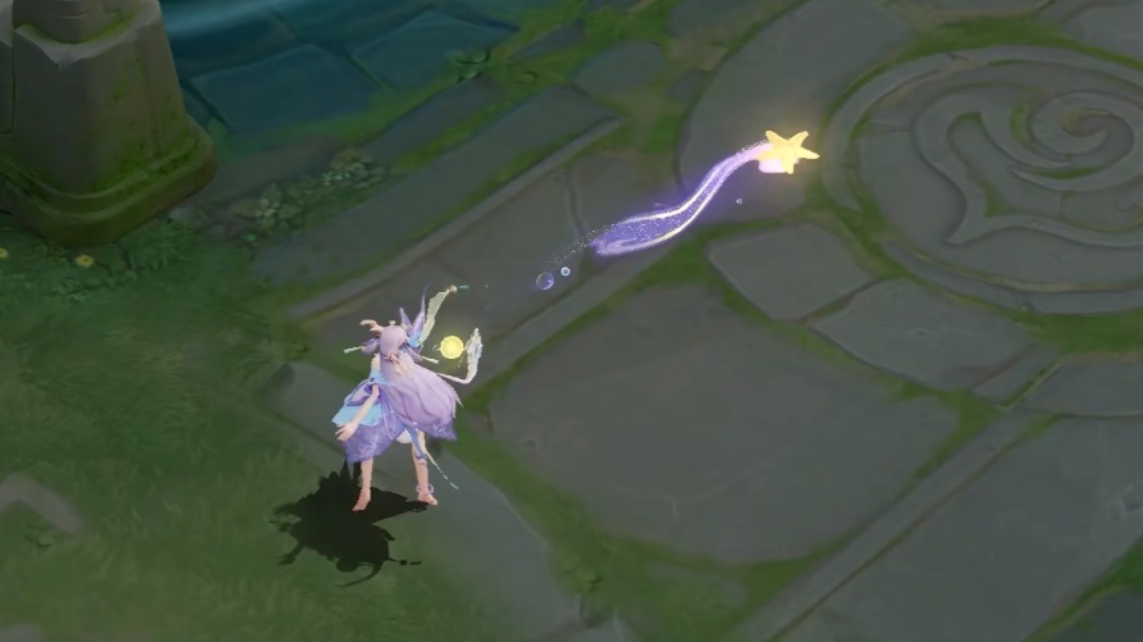 接下来看一下局内的技能特效表现,首先就是普通攻击,可以看到,在释放之后,普通攻击变成了一个五角星,五角星的后面有紫色的拖尾特效,后面还有一些气泡等相关元素,不得不说,这紫色的普通攻击特效很符合这款皮肤的服装设计。