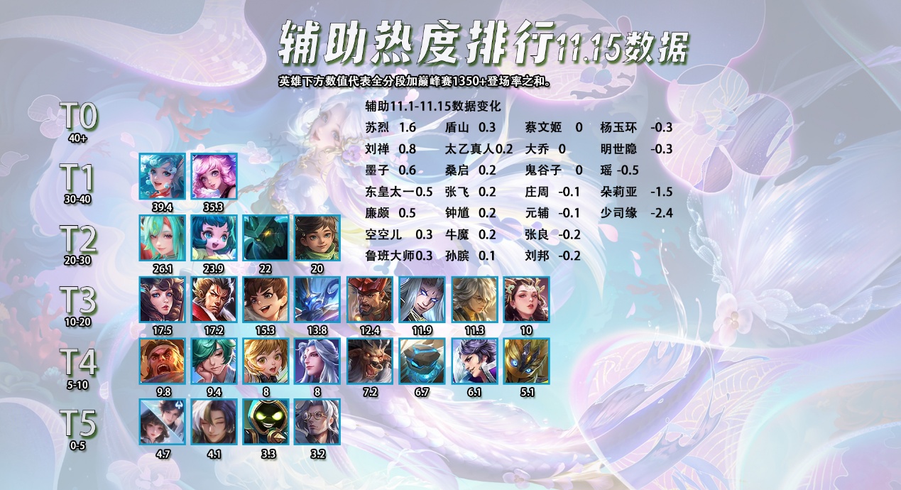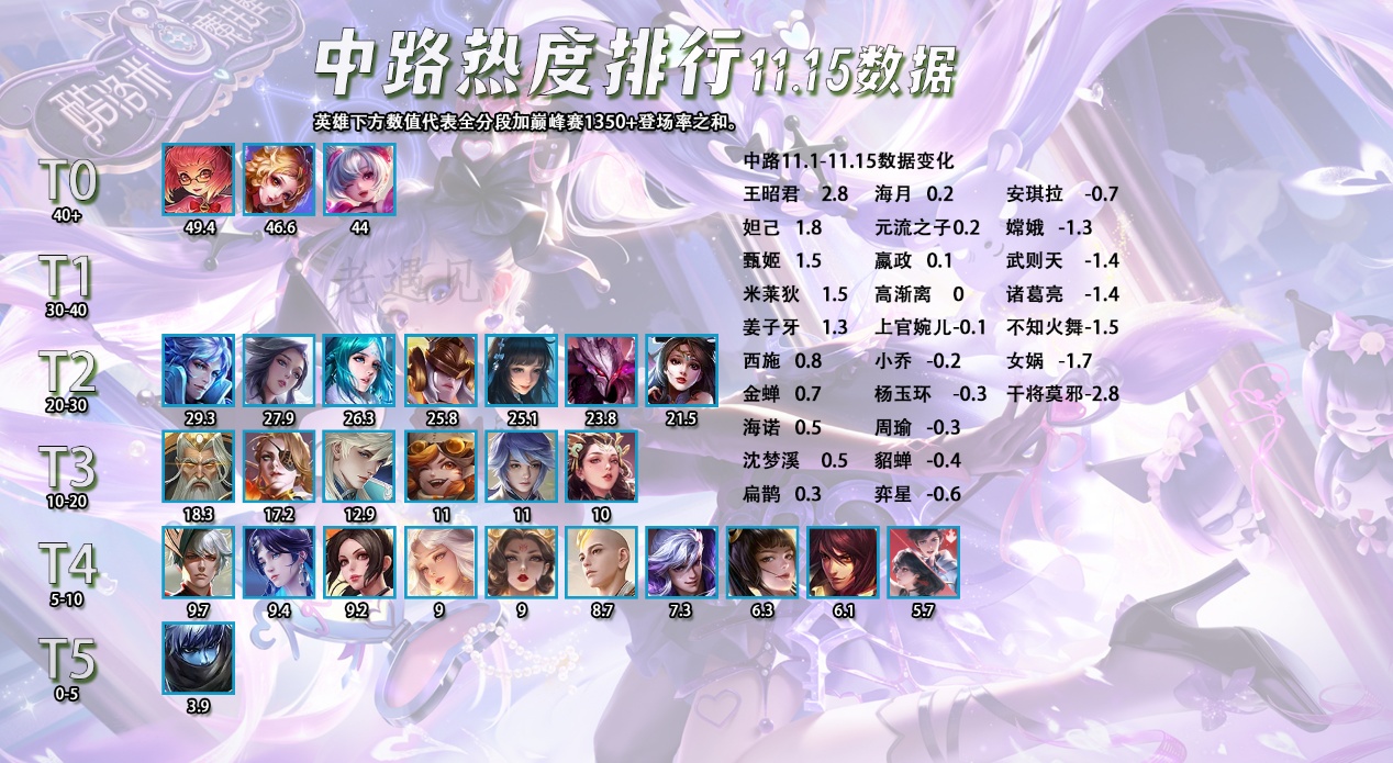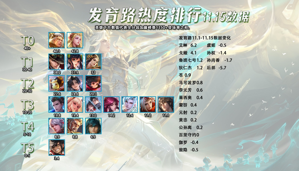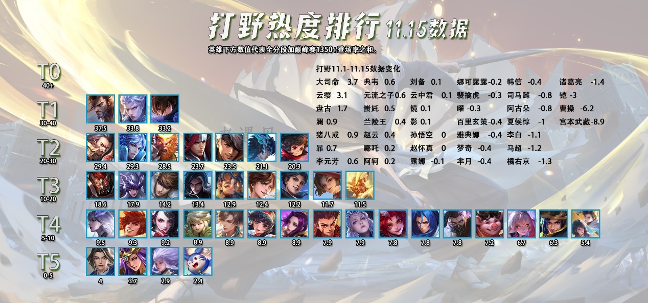 这一次出场率增长的英雄中,有很多是在刚结束的年度总决赛中表现不错的英雄,比如打野位的大司命,对抗路的狂铁,发育路的艾琳,戈娅,辅助位的苏烈,中路就没有了,因为中路这个位置路人局跟比赛的差距还是比较明显的,玩的都不是同一批英雄。