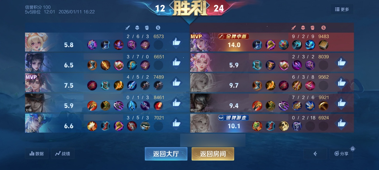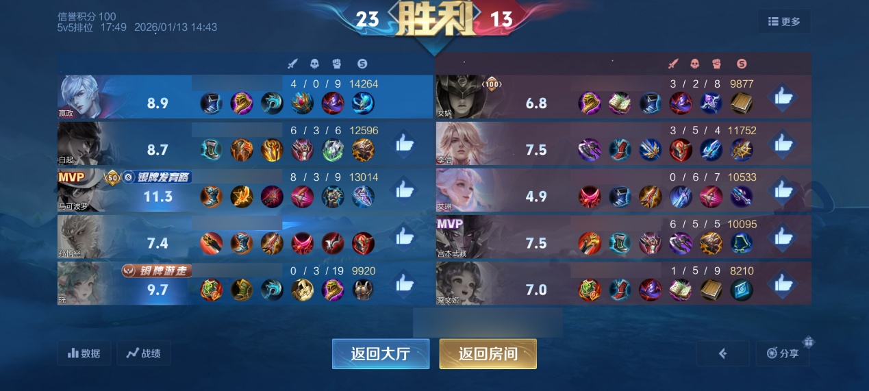 再看对面阵容,没有前排,没有控制,唯一对法师有威胁的就是这个宫本武藏,对面中路还没有选,除非补一个控制能力强的,就像是案例二一样补个甄姬什么的,控制能力不强对面这个阵容就太烂了。