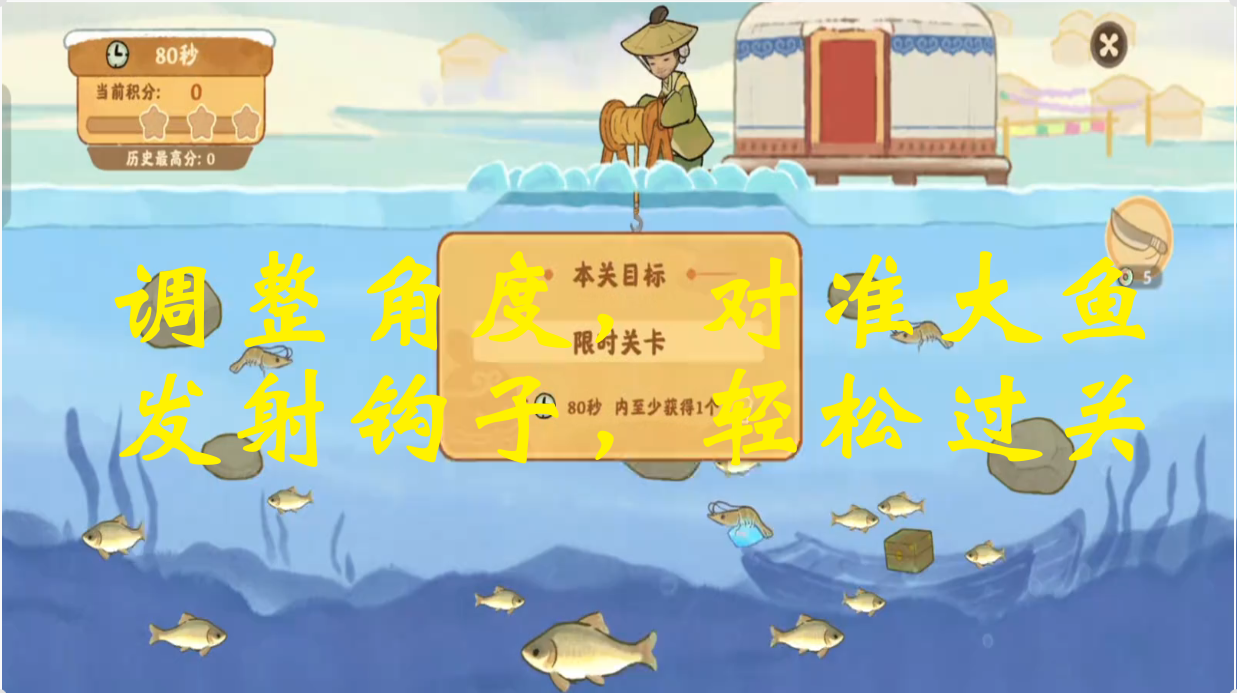 调整角度,对准大鱼,发射钩子,轻松过关。