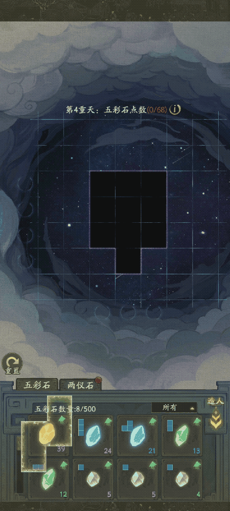 在镶嵌时,会对五彩石的总点数有要求,只有完成缺口形状镶嵌并同时满足点数要求才能补天成功,进入下一重天。