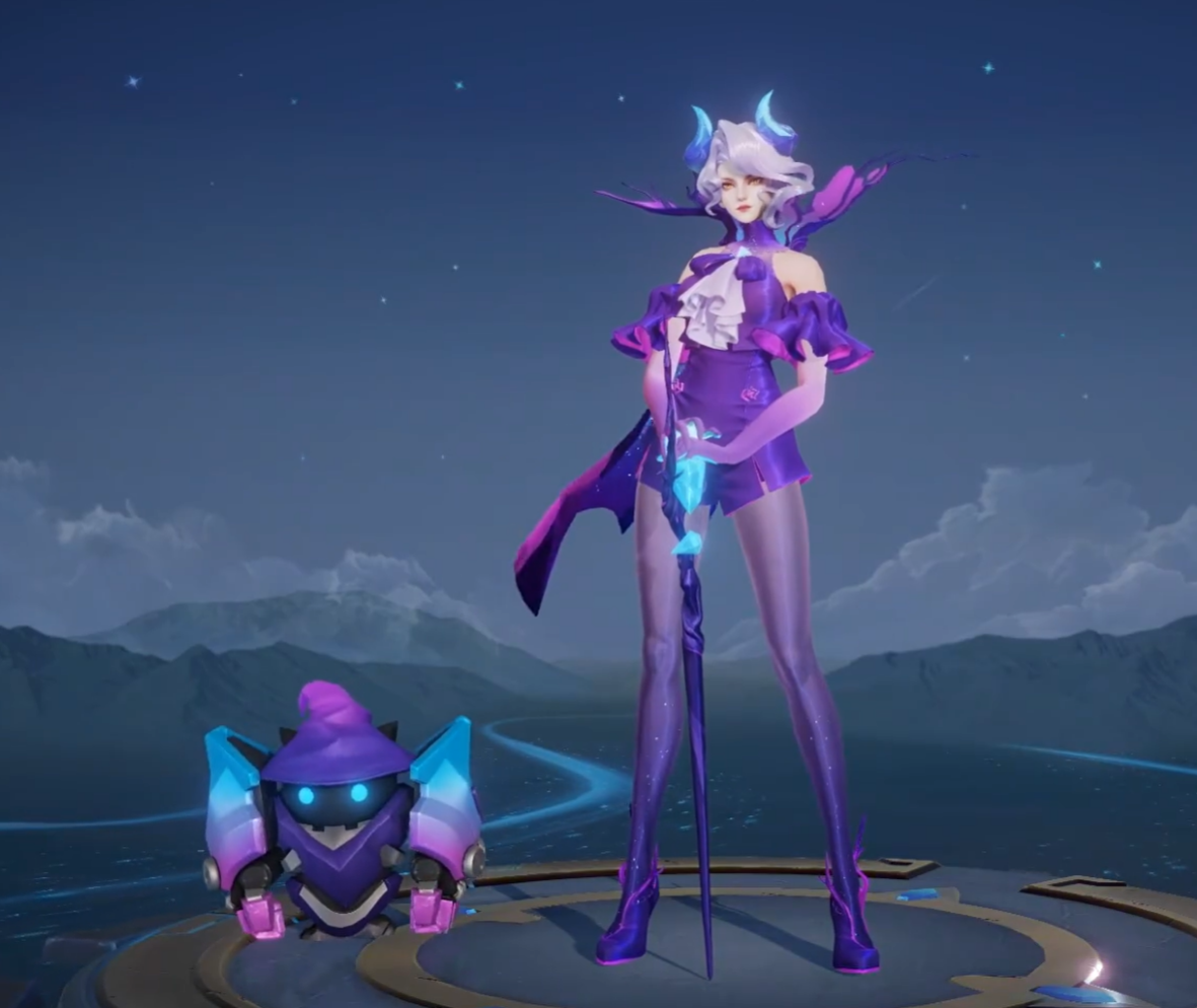 皮肤的建模和海报基本上接近,还原度极高,星空渐变丝袜倒是很性感,小兵的模样看着就有踹一脚的冲动,非常可爱,米莱狄头上的两对牛角的确没 弄懂是什么含义,是这个世界里的人都有牛角,还是王位的象征呢?
