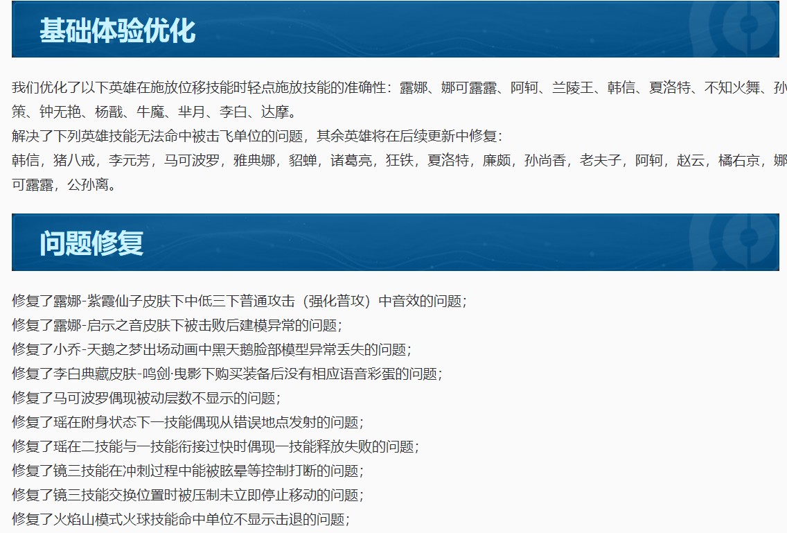 这次优化了一大批的英雄,我查了一下一共涉及了31个英雄的基础体验,部分英雄调整了位移技能的释放准确性,以及敌方英雄被击飞,自身技能会空掉的问题,果然王者峡谷是个3D的视角,当年关羽2技能跳出马超强普范围的画面还历历在目。