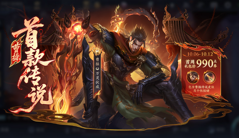 曹操传说皮肤上架这个皮肤就稍微晚一点了,在10月6日正式上架,首周皮肤礼包990点券,甚至可以用绑定点券买,礼包包含皮肤和个性按键,性价比是很高的。