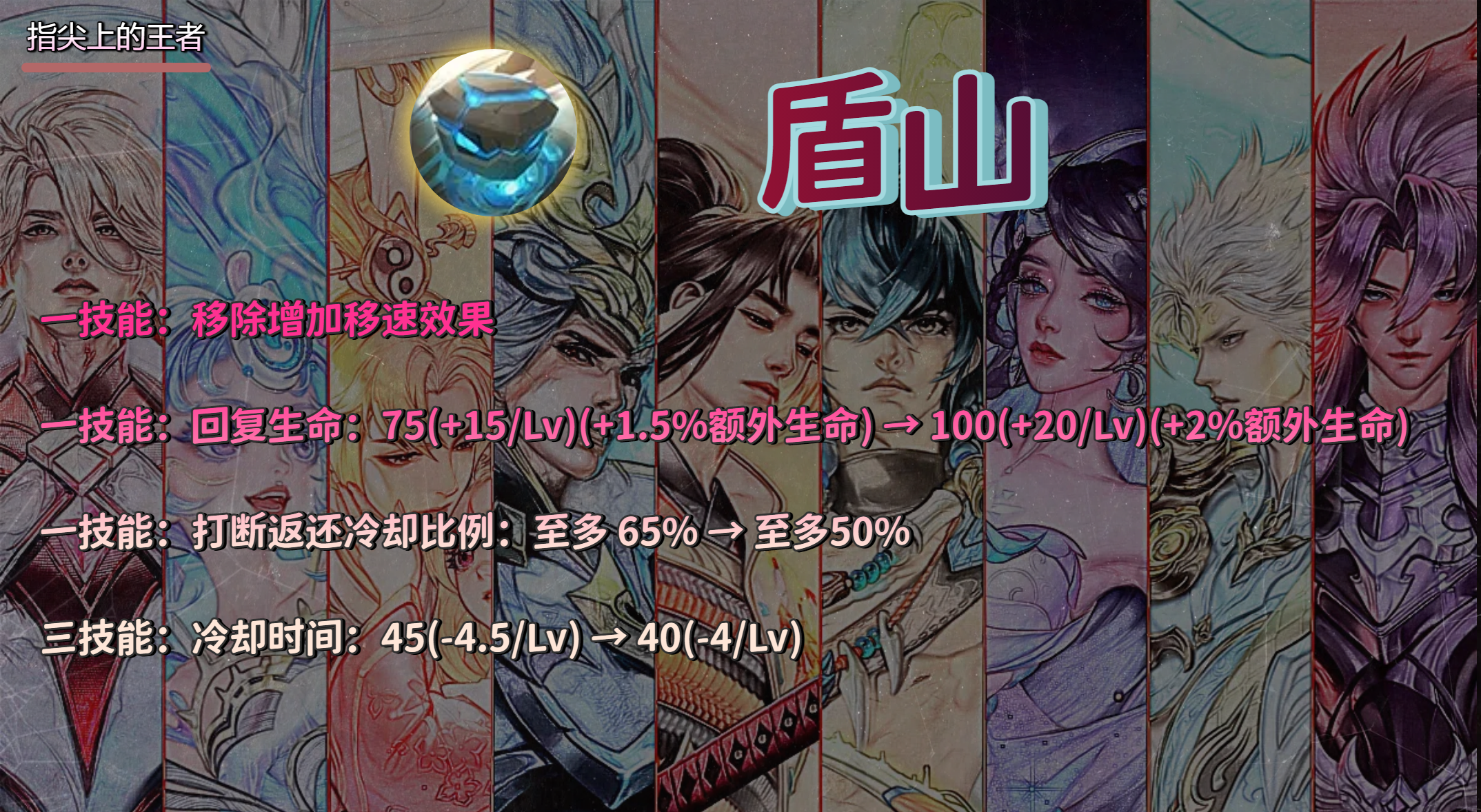 英雄调整-盾山本次更新的平衡相关调整,只有一个盾山,我只能说,盾山的真正实力(胜率)还没有展现出来,策划就先来个未雨绸缪,先刀了再说,预计我们看不到的数据中,盾山已经超标严重,不然这一刀不会砍这么狠。