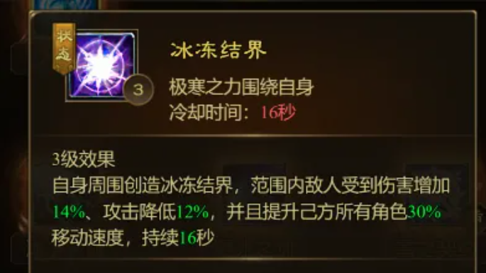冰冻结界:制造冰冻结界,我方增加移动速度,周围敌人降低攻击并且受到伤害百分比增加。
