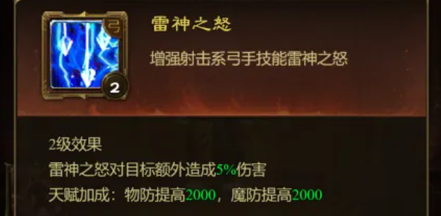 评价:提升雷神之怒的伤害,雷神之怒是常驻的增益技能,所以会较为明显的提高弓手的持续输出能力。