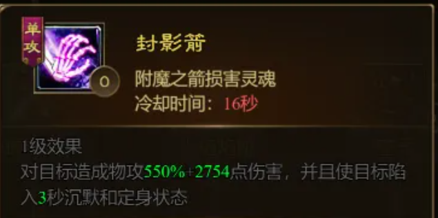 封影箭:对单体造成高额物理伤害,并且使目标陷入沉默和定身。