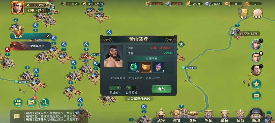 作用:击破要塞后, 要塞周边会刷新溃兵(资源州为40级),攻击溃兵不消耗军令,随机获得元宝及强化石奖励;