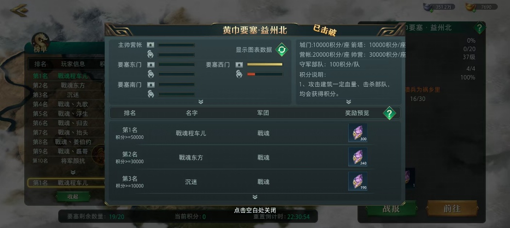 黄巾要塞每晚20点至21点开放,需通过“攻打前哨→破门和拆箭塔→破主营→清溃兵”的流程逐步推进: