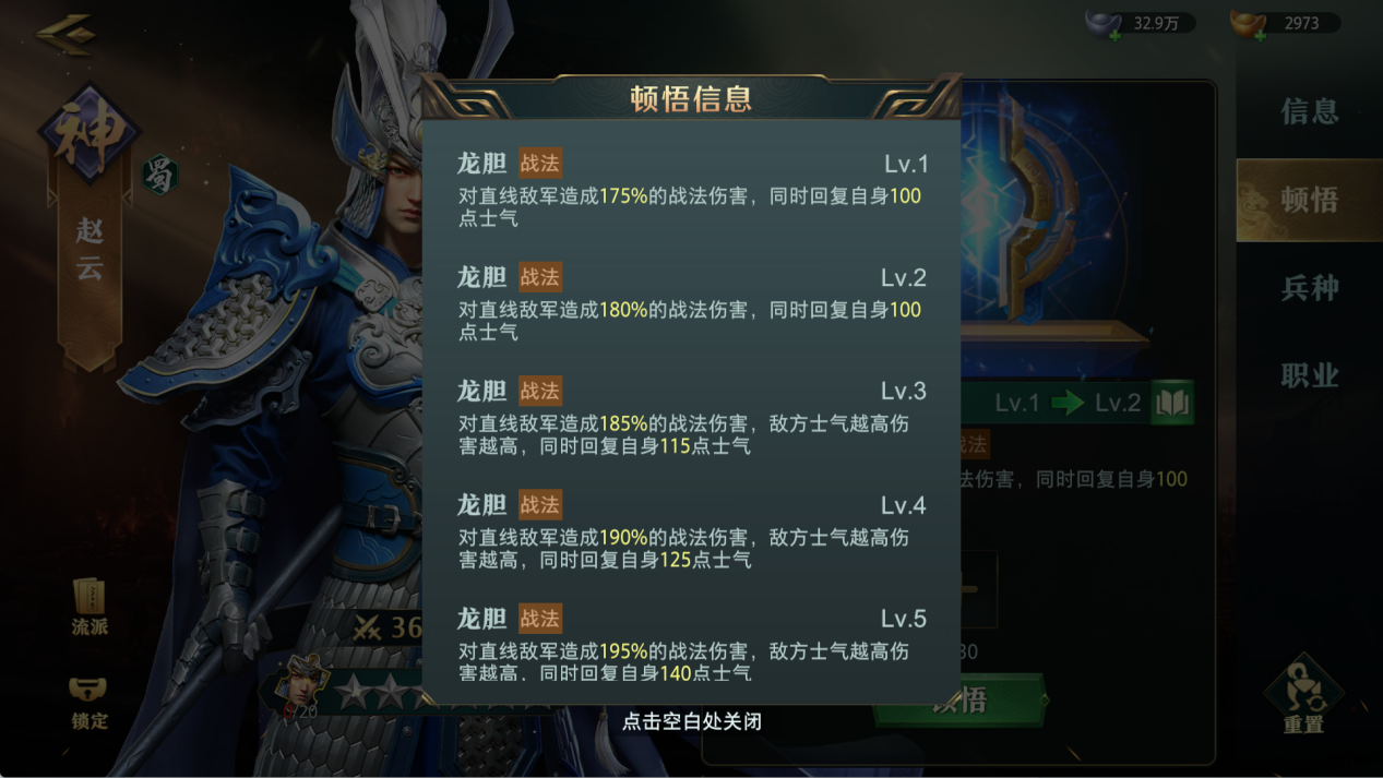 顿悟作用:大幅强化武将专属技能,不同系别(战法/物理/计策)效果各异。