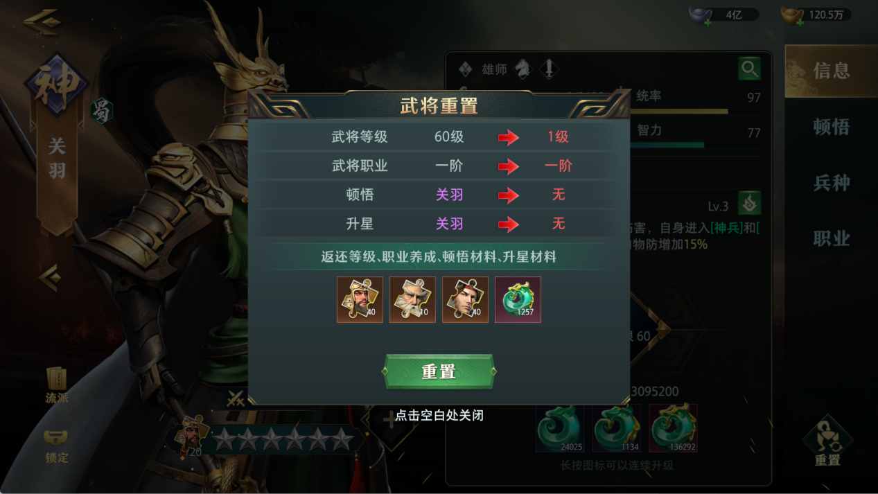 如果对当前培养的武将不满意,可使用 重置功能: