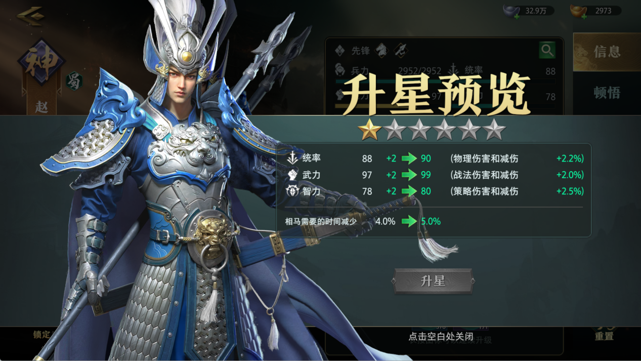 武将升星可增加武将的统帅、武力、智力属性效果,具体获得属性为升星消耗÷10,同时提升每个武将专属的内政效果。