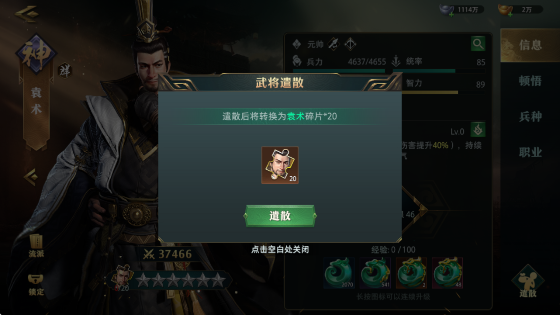 如果暂时用不到某个武将,也可以进行遣散功能,武将遣散能获得武将碎片*20,可用于其他同阵营武将的顿悟消耗。