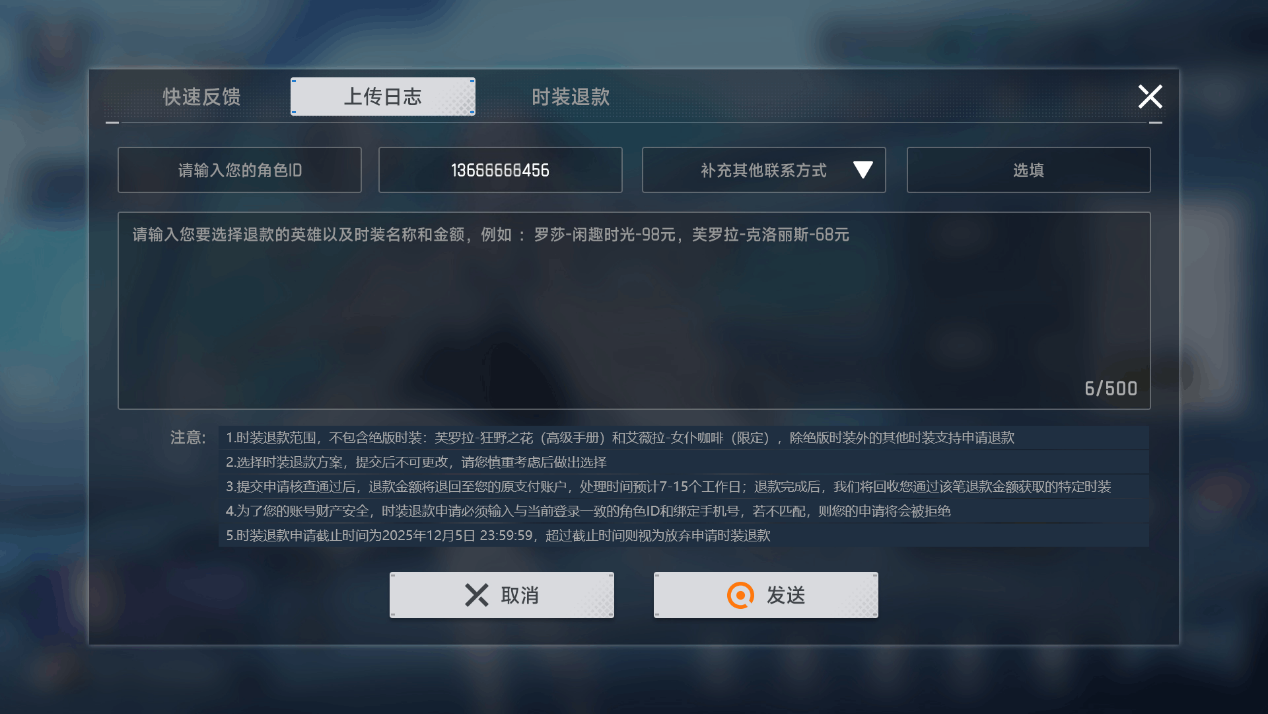 4.为了您的账号财产安全,时装退款申请必须输入与当前登录一致的角色ID和绑定手机号,若不匹配,则您的申请将会被拒绝。