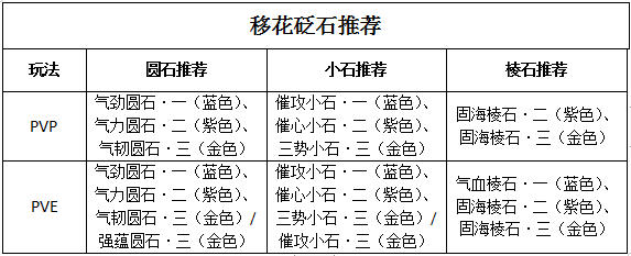 2、 移花PVE砭石推荐1、 PVE圆石推荐在PVE中由于队伍中有天香存在,移花在不切辅助的情况下,砭石方面可以不用关注气血和抗性的加成,尽量优先攻击和气劲去堆叠伤害,圆石方面推荐使用【气劲圆石·一】和【气力圆石·二】