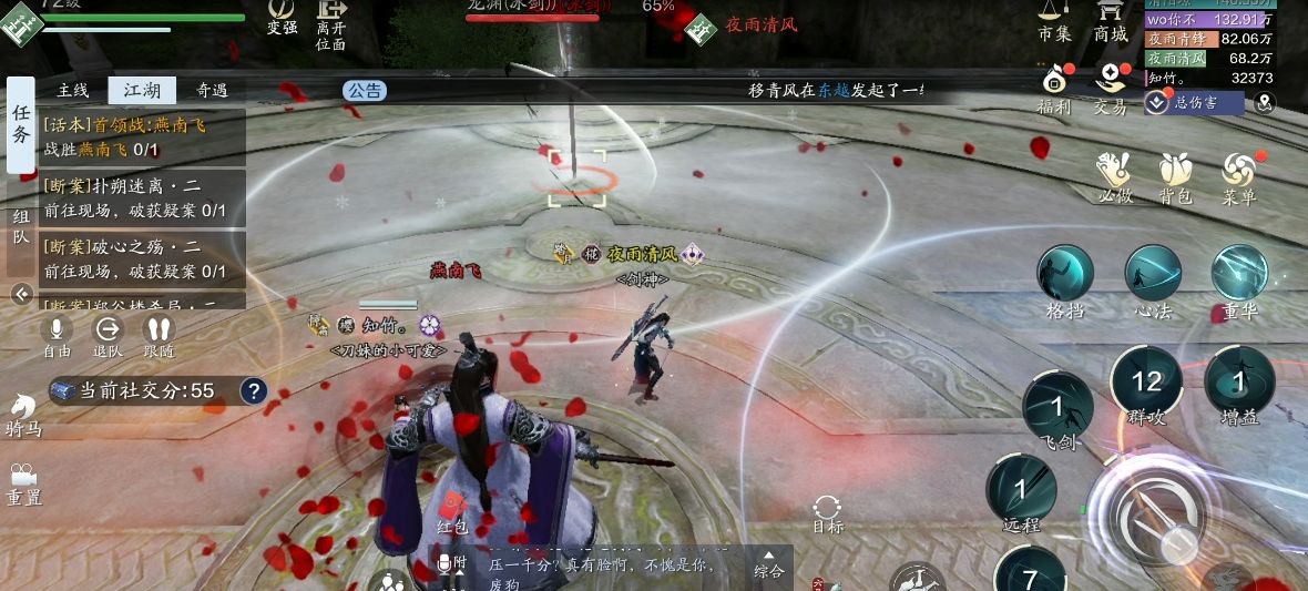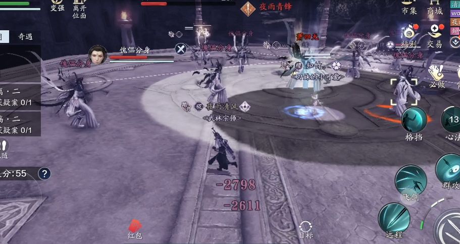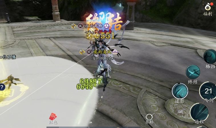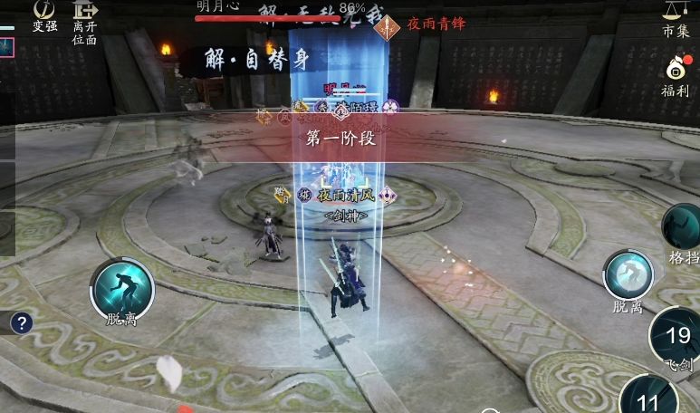 心剑:燕南飞会标记一个人,第一次被击中会被击倒,但问题不大。如果第二次被击中那么会造成大量的伤害。需要队友提前帮忙过来挡。有一条红色的线,站在线上就可以抵挡飞剑的路径。真武在外围输出也可以自行调整位置,让队友帮忙挡。注意真武的上善是没办法格挡的。