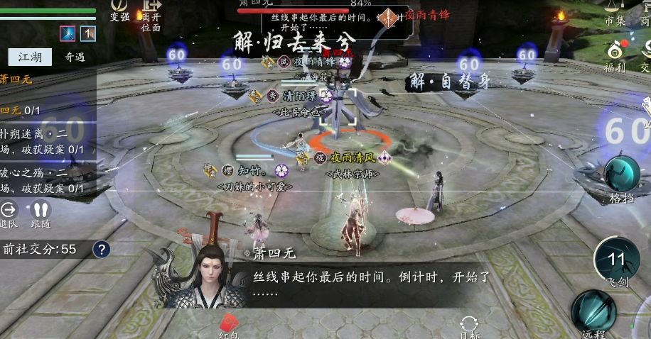 悬丝断魂引:悬丝断魂引会倒计时60秒,倒计时结束后会从机关中射出无数利刃,造成大量伤害。只需要用追命飞刀去切断悬丝断魂引就可以阻止伤害,站在最远的玩家身上会有追命飞刀。真武玩家可以在最外围进行一边输出一变破坏机关,当然奶妈更加合适。