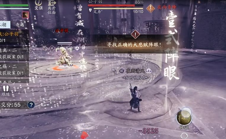 大悲七赋:公子羽施展阵法,自己在阵法内,玩家在阵法外会持续掉血,需要找到阵眼点击传送即可。但是随着释放的次数增加,阵眼会越来越多,需要寻找真的阵眼。