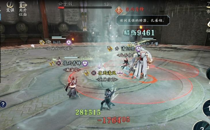 孔雀翎:随机选择玩家在其脚下,释放孔雀翎,造成大量伤害。被点名的玩家一定要自己跑出去放到远离公子羽的位置,要不然近战玩家会非常痛苦。第五次释放时会狂暴,所以对于团队的伤害有一定的要求。