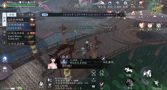 活动任务了解到相关规则之后,便要开始做活动任务了。根据任务描述,活动期间,需要统一队伍的四位受邀玩家中,有1名等级达到50级,2人等级达到40级,3人等级达到35级。综合来看,实际上,只需要1名玩家达到50级,2名达到40级,剩下的1位只需能够加入队伍即可。而可以加入队伍的门槛,通过实测可知为5级,即需要将江南主线做到打败辽人闹事者即可。
