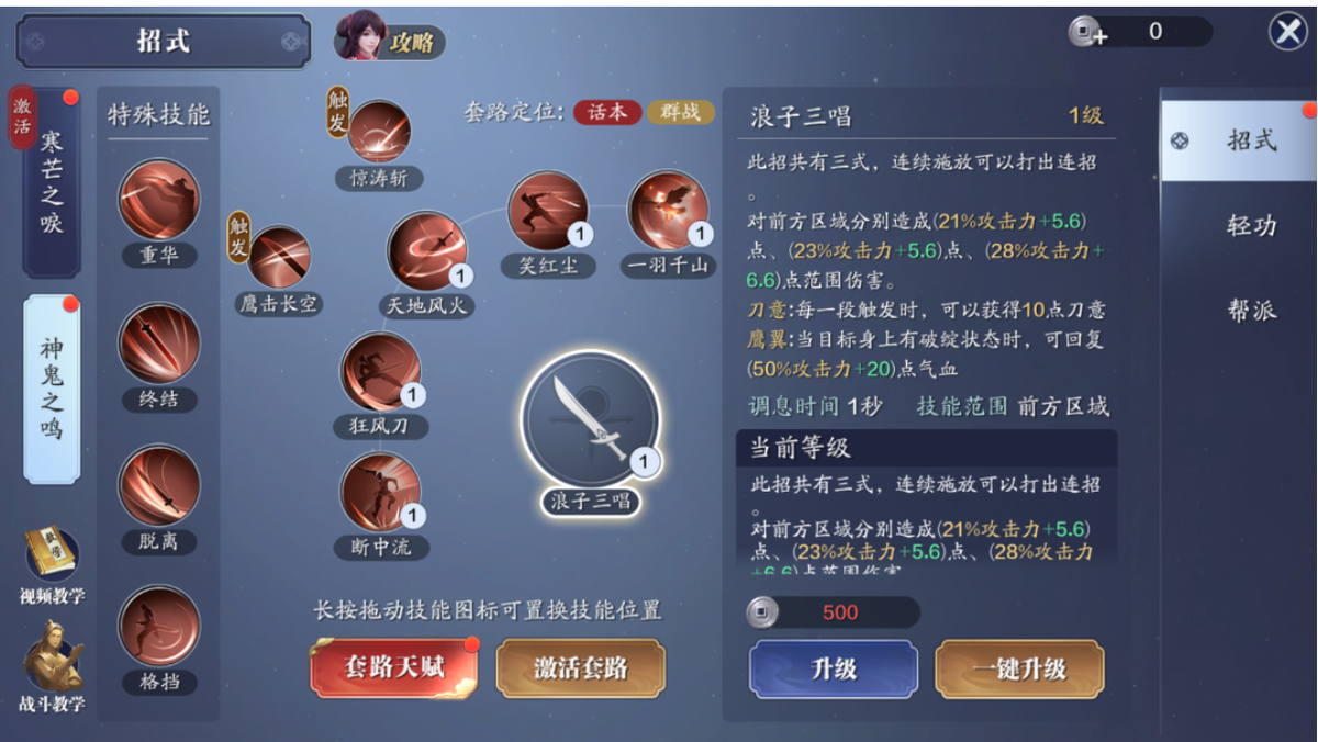 套路二,根据分析猜测,副本方面,更多是靠狂风刀和笑红尘消耗破绽的循环思路,来造成伤害,破绽则需要一羽千山、笑红尘等技能积累,鹰击长空何时释放是对神刀的一个挑战,或许可以刷出瞬间啊双狂风刀的套路。以上分析仅仅是根据现有资料以及门派技能经验总结而出,并非正式效果,仅供参考,一切还以正式更新为主。