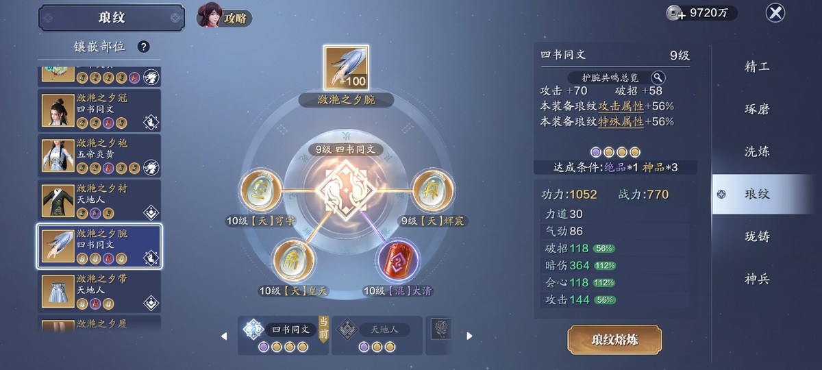 101级开放护腕第四个孔,相信现在大家都是2金1紫的组合。新的孔位可以使用188填充,一个10级188总共需要133个1级188琅纹。也可以使用新的紫色混沌琅纹填充,1个新的自得混沌琅纹需要201个1级琅纹,2.4万琅纹碎片。